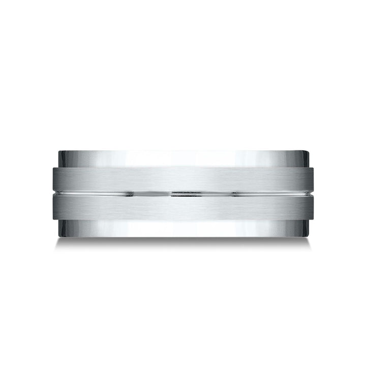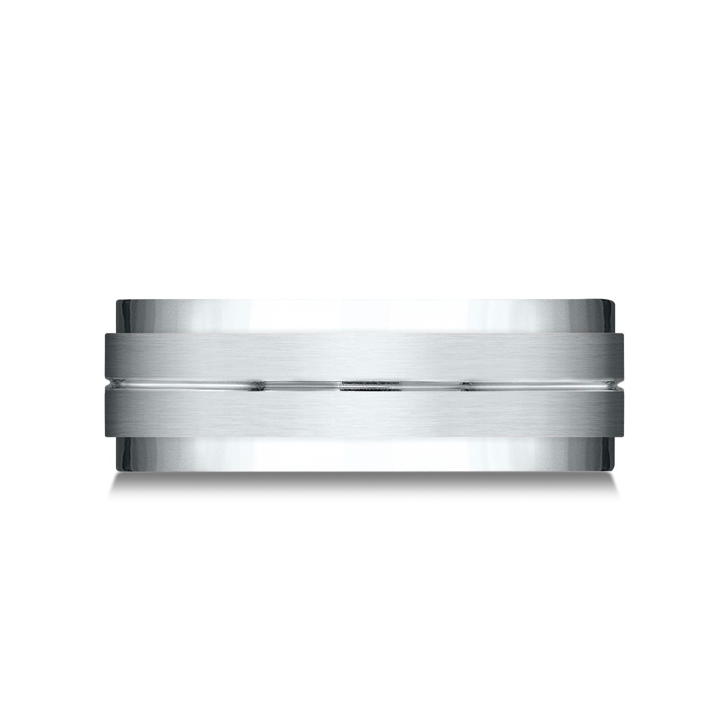 แถบดีไซน์ Comfort Fit ขนาด 8 มม. จากแพลตตินัมนี้มีขอบแบบ Drop Bevel ที่ขัดเงาสูง แสดงให้เห็นถึงส่วนกลางที่มีผิวด้านซาติน