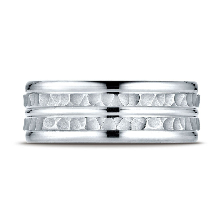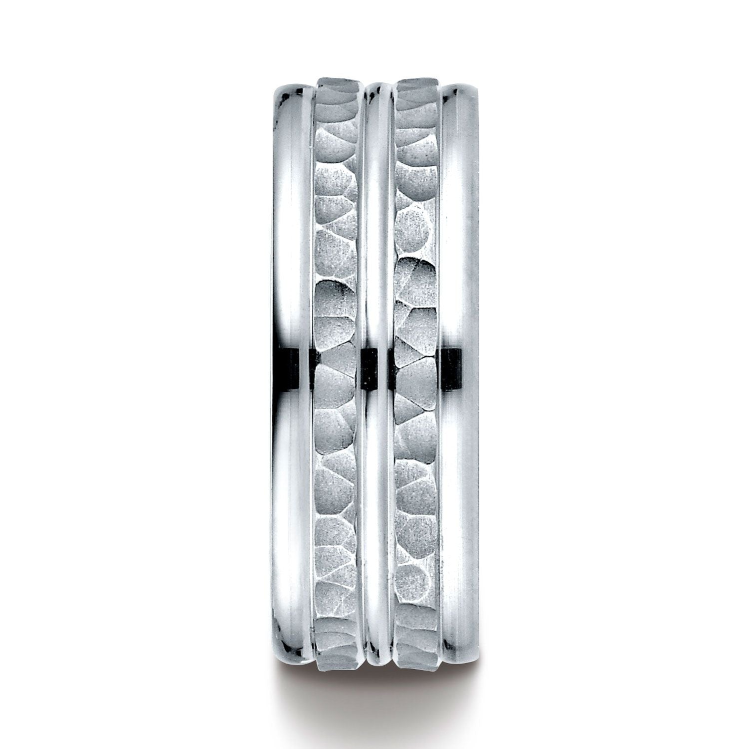 แหวนดีไซน์แกะสลักแบบค้อนขนาด 8 มม. ที่สวมใส่สบายนี้ทำจากแพลตตินั่มที่น่าทึ่ง มีขอบกลมขัดเงาสูงและขอบกลางที่ตกแต่งซึ่งให้ความสม่ำเสมออย่างละเอียดอ่อนในสไตล์และรูปทรง