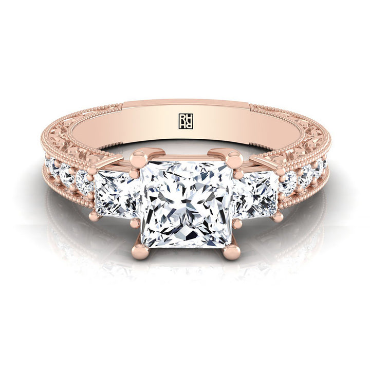แหวนหมั้นช่องแบบวินเทจสามเม็ดสลักมือเพชรทรงเจ้าหญิงทองกุหลาบ 14K น้ำหนักรวม 3/4 กะรัต