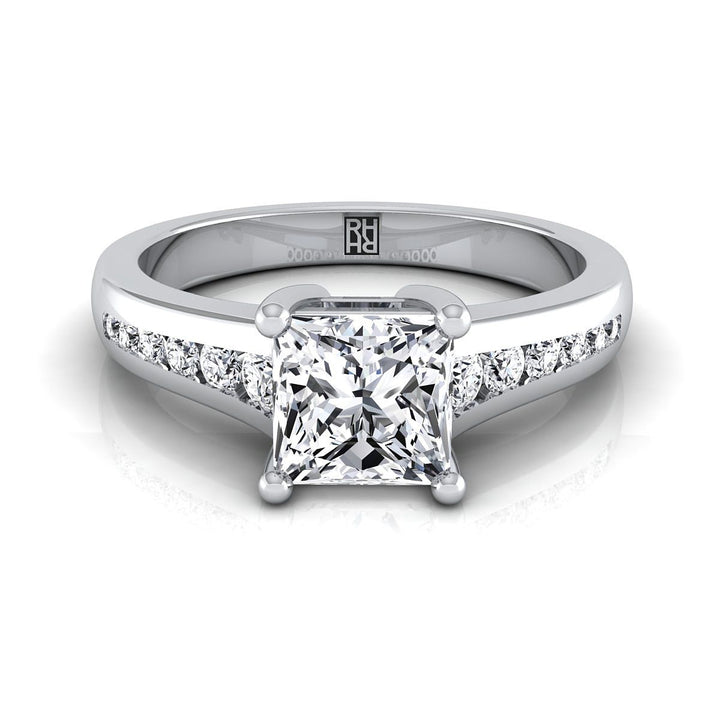ผลิตด้วยมืออย่างประณีตในทองคำขาวแท้ 14 กะรัต แหวนหมั้นเพชรทรงเจ้าหญิงแบบติดตั้งช่อง (h-i/vs 0.17 กะรัตรวม) นี้สร้างการตั้งค่าที่สมบูรณ์แบบสำหรับเพชรเม็ดเดียวคลาสสิกที่จะคงอยู่ตลอดชีวิต