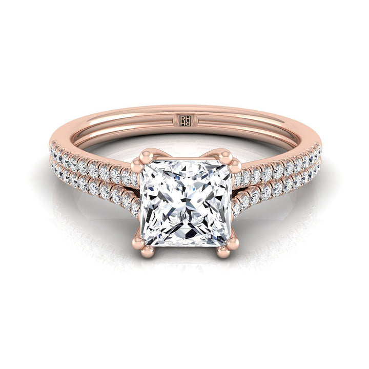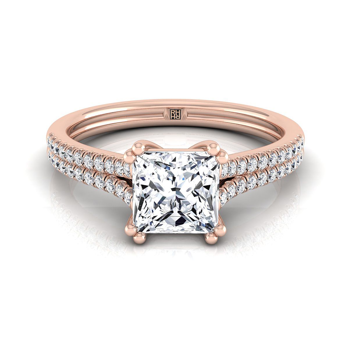 แหวนหมั้นเพชรทรงเจ้าหญิง 14K ทองกุหลาบสองแถวสองกรงเล็บแบบฝรั่งเศส ประดับเพชรรวม 1/6 กะรัต