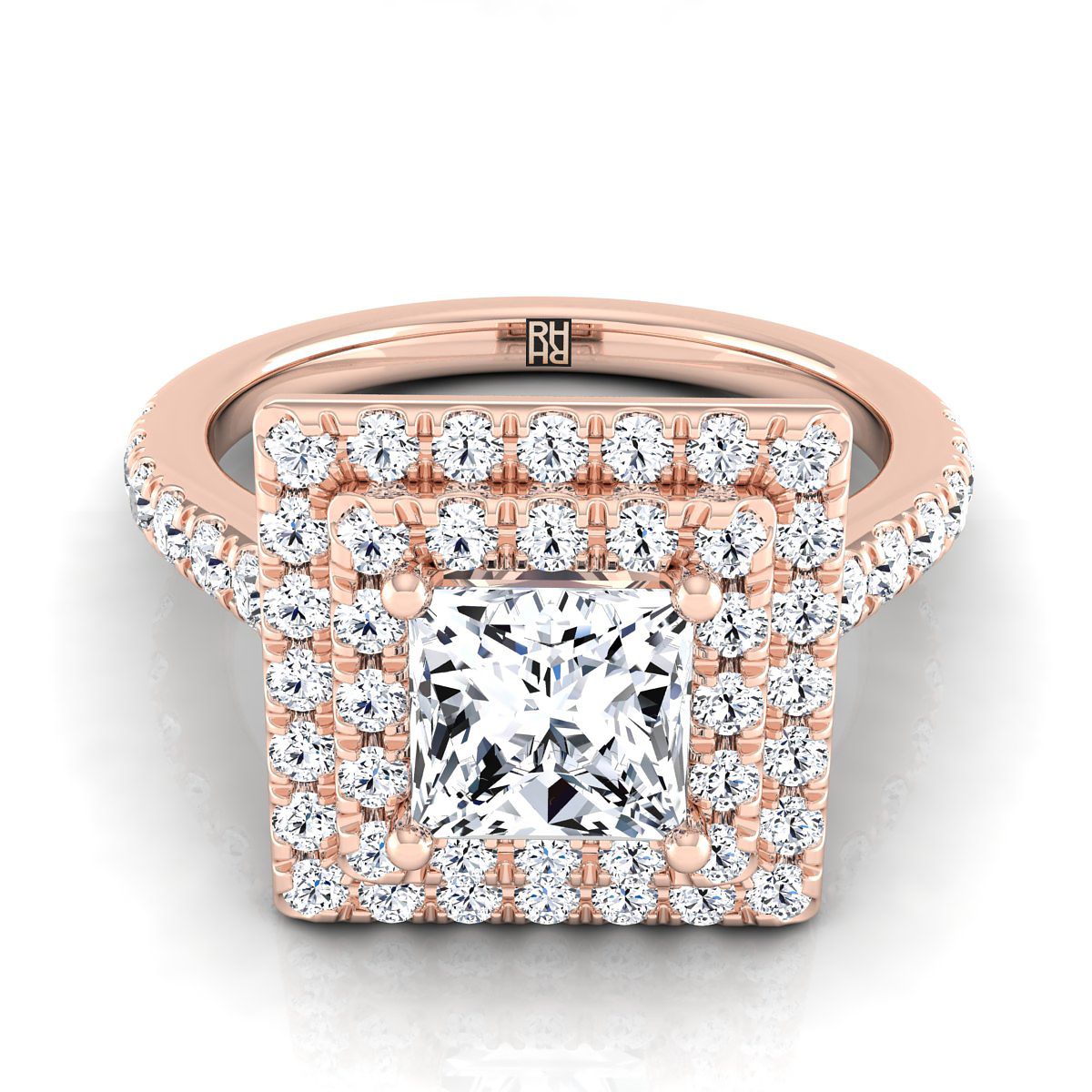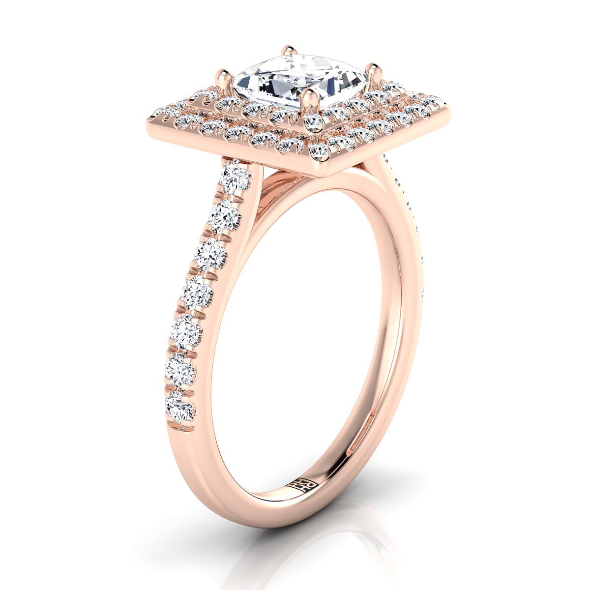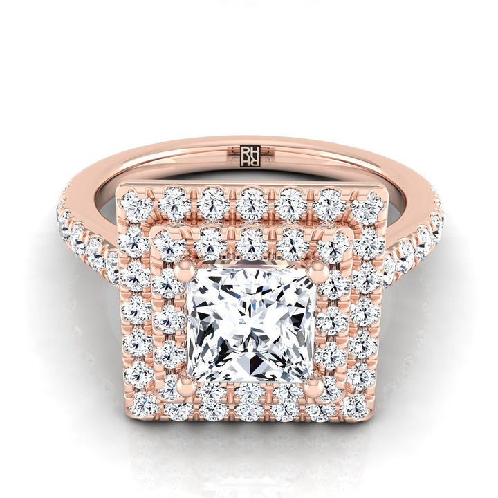 แหวนหมั้นเพชรทรงเจ้าหญิง 14K ทองกุหลาบ ประดับเพชรแบบดับเบิลเพฟและฮาโลแบบเส้นตรง น้ำหนักรวม 7/8 กะรัต