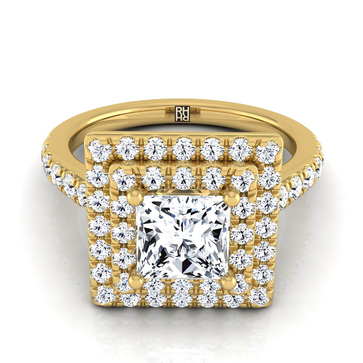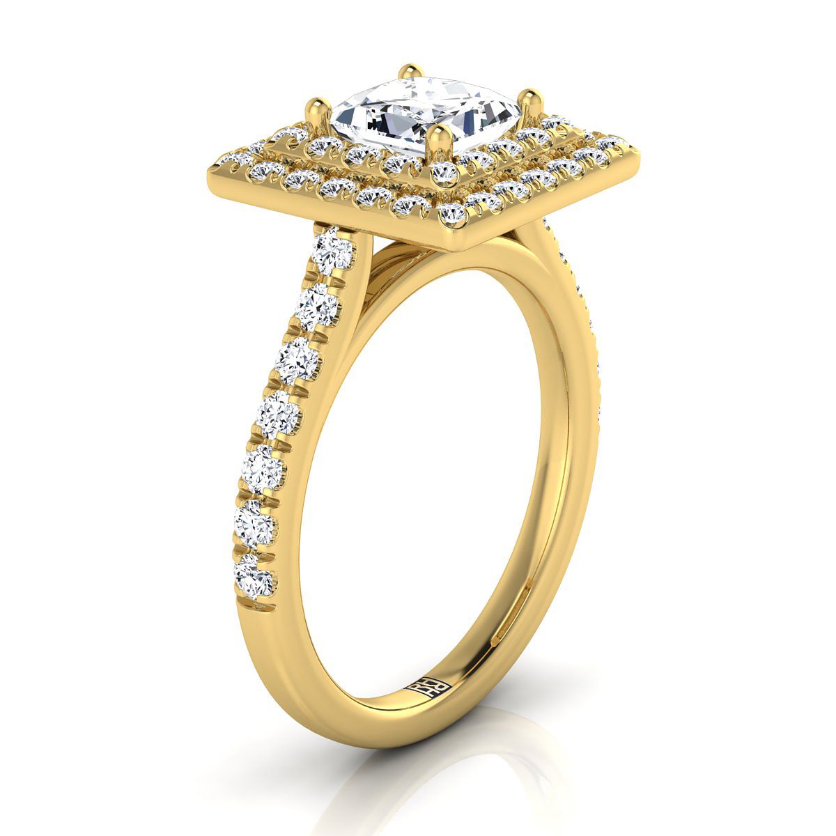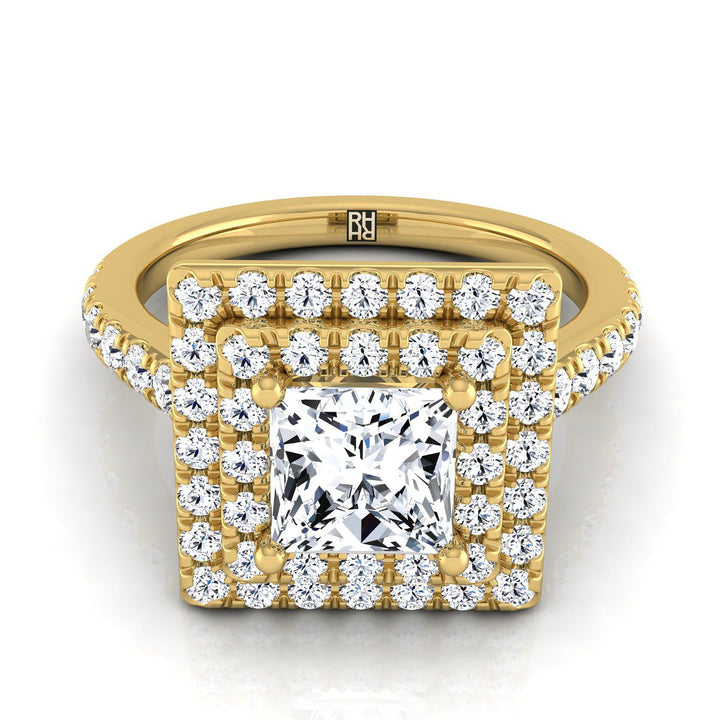 แหวนหมั้นเพชรทรงเจ้าหญิงแบบดับเบิลเพฟ ฮาโล่ พร้อมเพชรเส้นตรง ทองคำเหลือง 14K - 7/8 กะรัตรวม