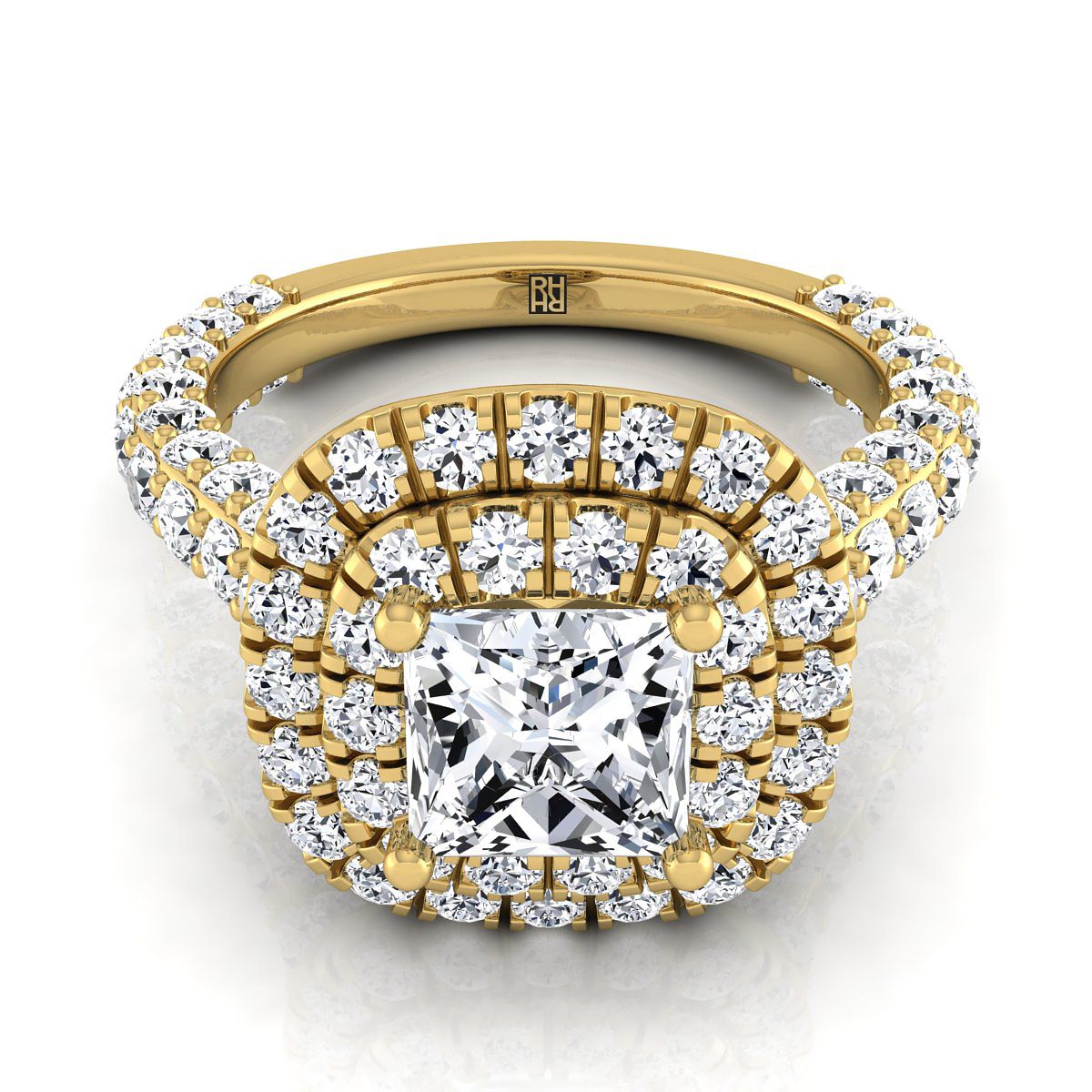 แถลงการณ์สไตล์ที่สง่างาม แหวนหมั้นแบบ Princess Cut Double Halo Pave นี้แสดงให้เห็นเพชรเจียระไนแบบ Brilliant Cut (h-i/vs 2.10ctw) พร้อมกับแถบเพชรแบบ Pave ที่ประณีต ติดตั้งในตัวเรือนทองคำ 18k สีเหลือง