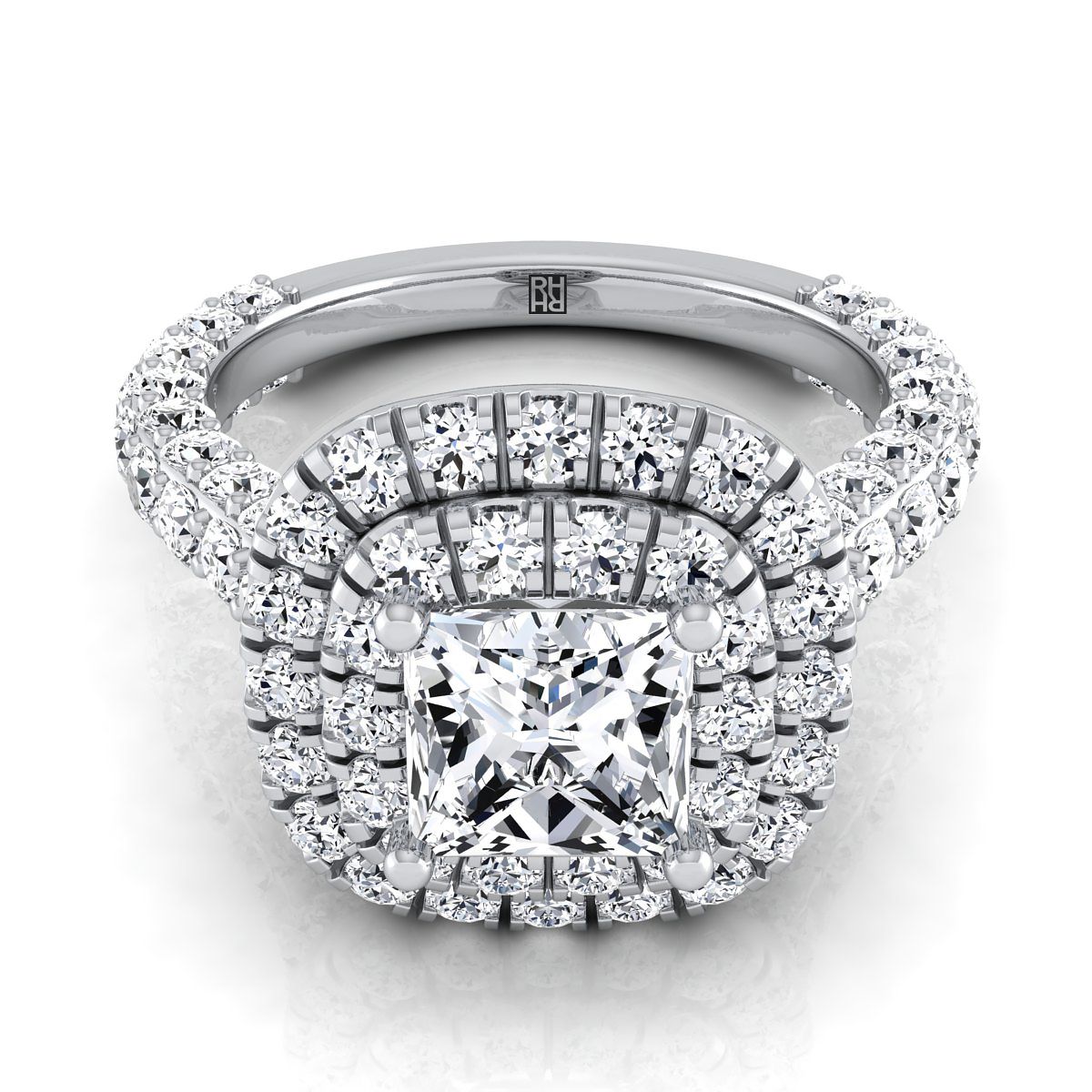แสดงสไตล์อย่างสง่างาม แหวนหมั้นแบบ Princess Cut Double Halo Pave นี้นำเสนอเพชรเจียระไนแบบ Brilliant Cut (h-i/vs 2.10ctw) พร้อมกับแถบเพชรแบบ Pave ที่ประณีต ติดตั้งในตัวเรือนแพลตตินัม