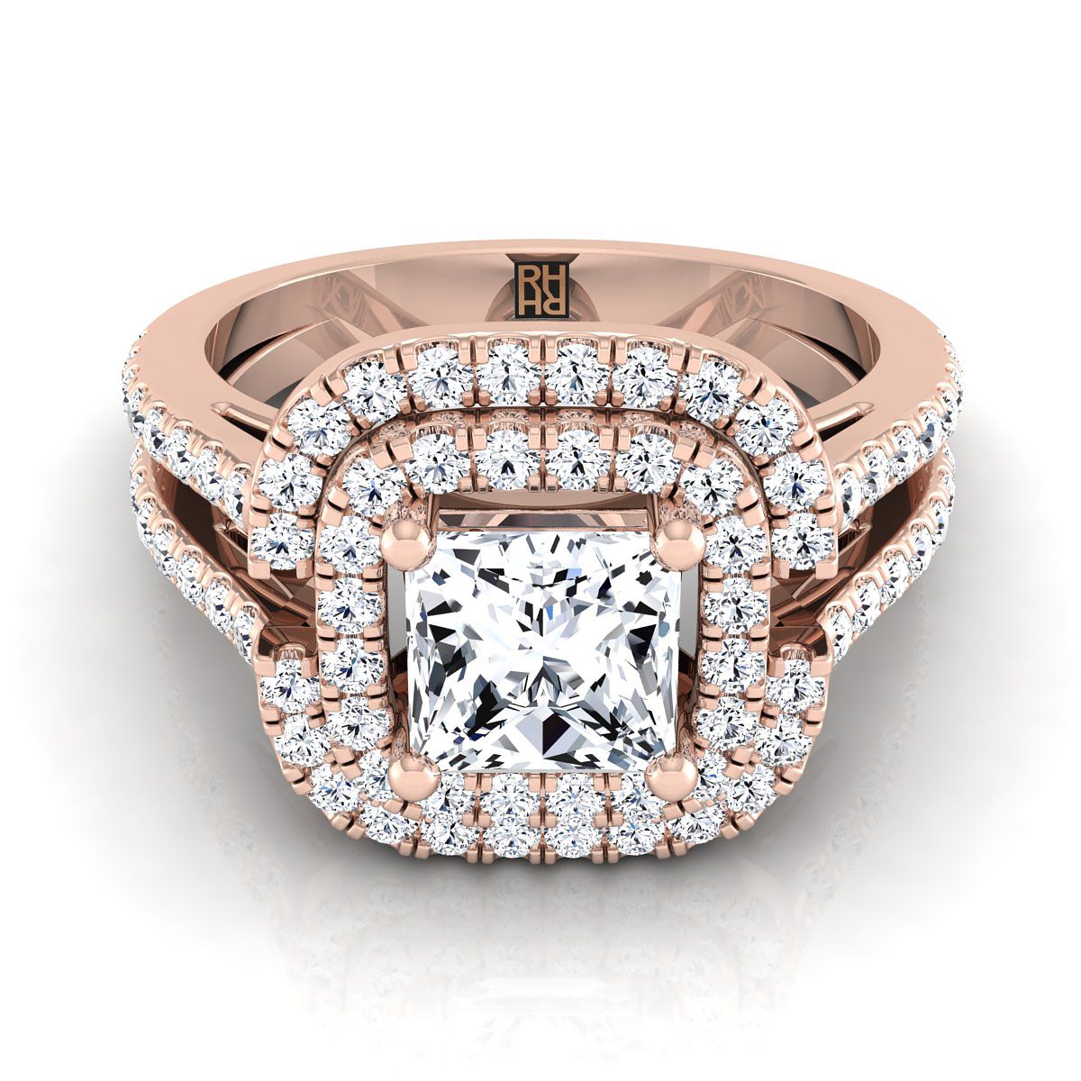 แหวนหมั้นทรงเจ้าหญิงแบบดับเบิลฮาโลที่ทำด้วยมืออย่างสวยงามนี้ มาพร้อมกับเพชรเจียระไนแบบ Brilliant Cut (h-i/vs 0.66ctw) ที่ถูกฝังอย่างชำนาญในตัวเรือนทองกุหลาบ 14k คลาสสิกที่มีดีไซน์แยกช้างพาเว่