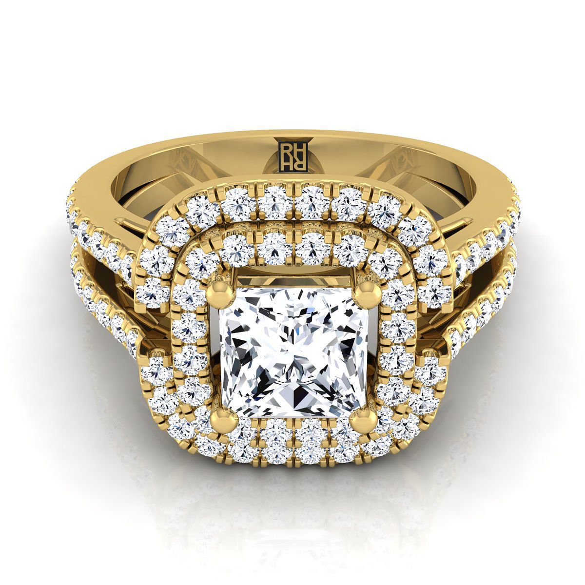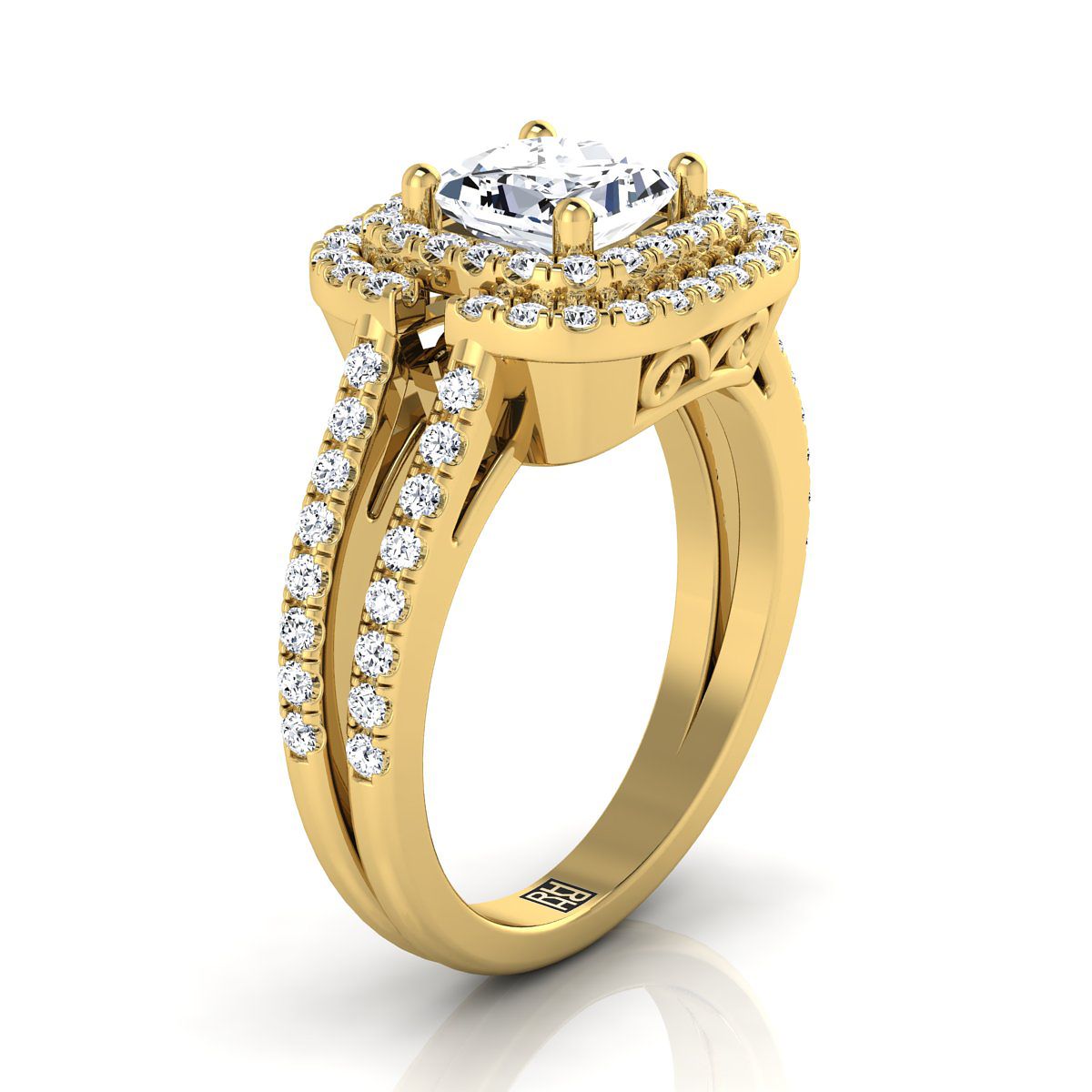 แหวนหมั้นทรงเจ้าหญิงที่ประดับด้วยวงแหวนคู่แบบฮาโลที่ทำด้วยมืออย่างสวยงาม พร้อมชิ้นแยกแบบพาเว่ที่แสดงให้เห็นเพชรเจียระไนแบบบริลเลียนต์ (h-i/vs 0.66ctw) ที่ถูกฝังอย่างชำนาญในตัวเรือนทองคำเหลือง 18k คลาสสิก.