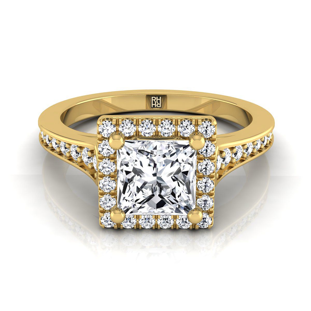 แหวนหมั้นเพชรทรงเจ้าหญิง 18K ทองเหลืองคลาสสิกฮาโลว์พร้อมช่องฝรั่งเศสปาเว่ -1/3ctw