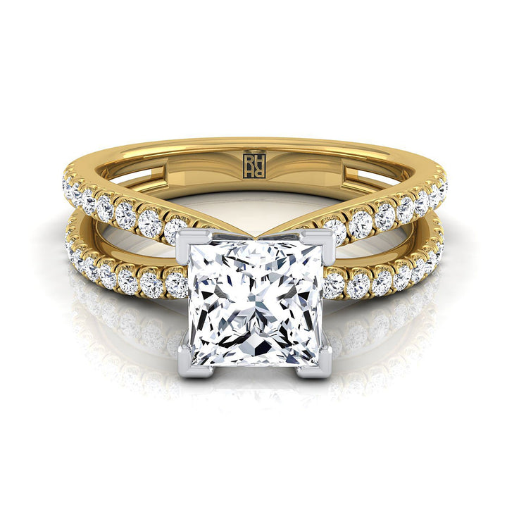 แหวนหมั้นทองคำเหลือง 14K ประดับเพชรทรงเจ้าหญิง ตัดแบบสองแถว พาวเว่ สปลิตแชงค์ -1/3ctw