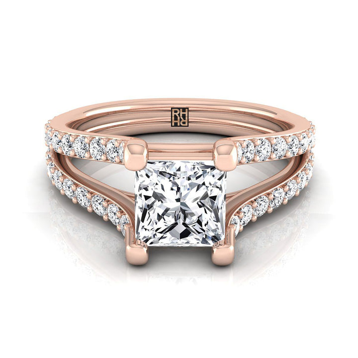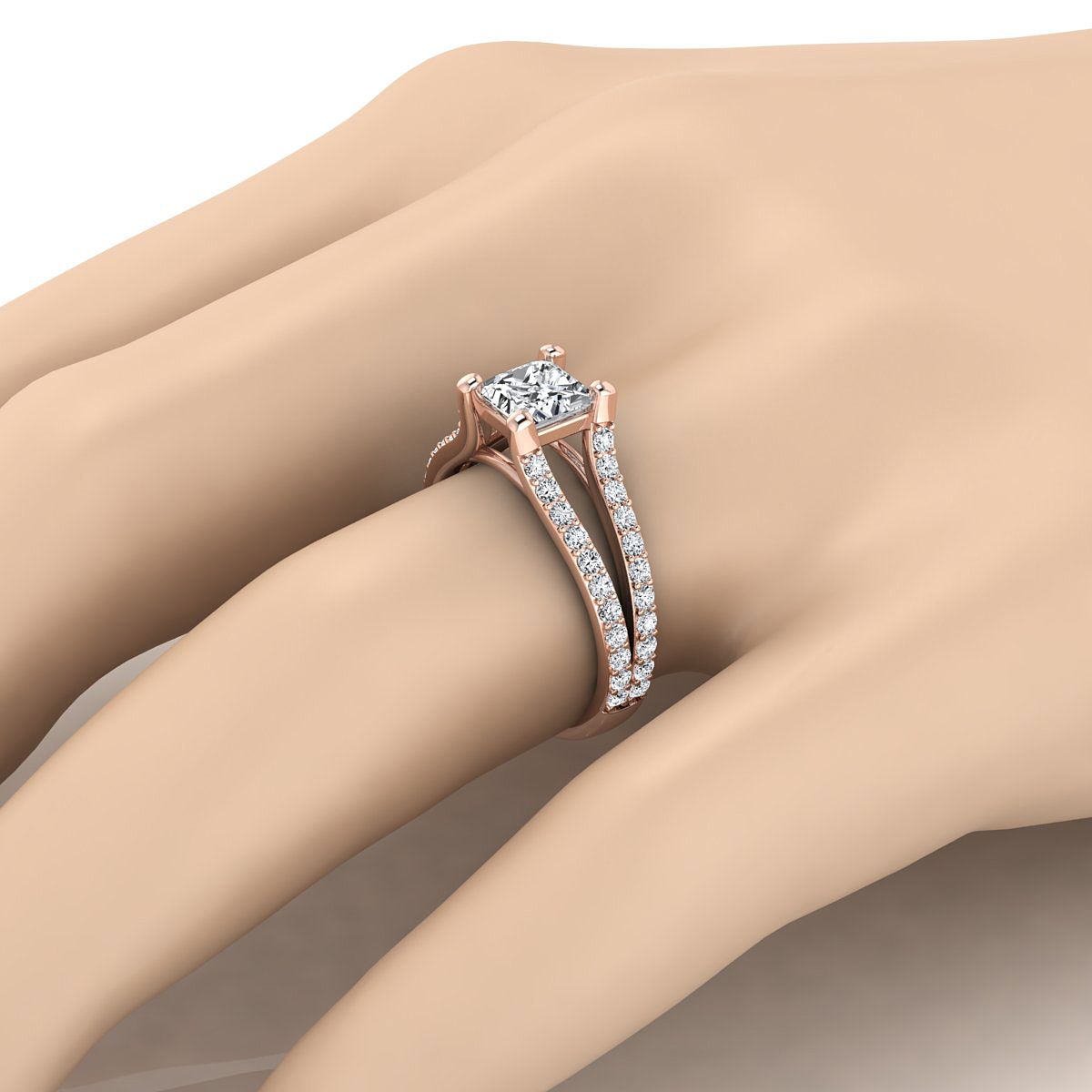 คลาสสิกและสง่างาม แหวนหมั้นเพชรทรงเจ้าหญิงทองคำชมพู 14k นี้แสดงให้เห็นถึงเพชรเจียระไนแบบ Brilliant Cut (h-i/vs 0.58ctw) ที่ประดับอย่างสวยงามในแบบ Pave Set บนแหวนแบบ Split Shank สร้างประกายแวววาวที่งดงามให้ทุกคนได้ชื่นชม