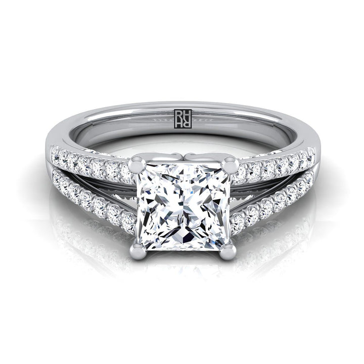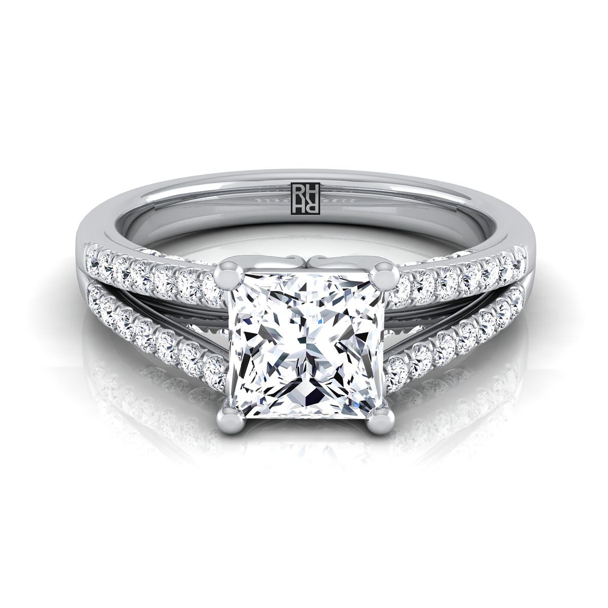 แหวนหมั้นเพชรทรงเจ้าหญิงที่สง่างามนี้พร้อมก้านแยกแบบปาเว่แสดงให้เห็นถึงเพชรเจียระไนแบบบริลเลียนต์ (h-i/vs 0.33ctw) ประดับในตัวเรือนทองคำขาว 14 กะรัต