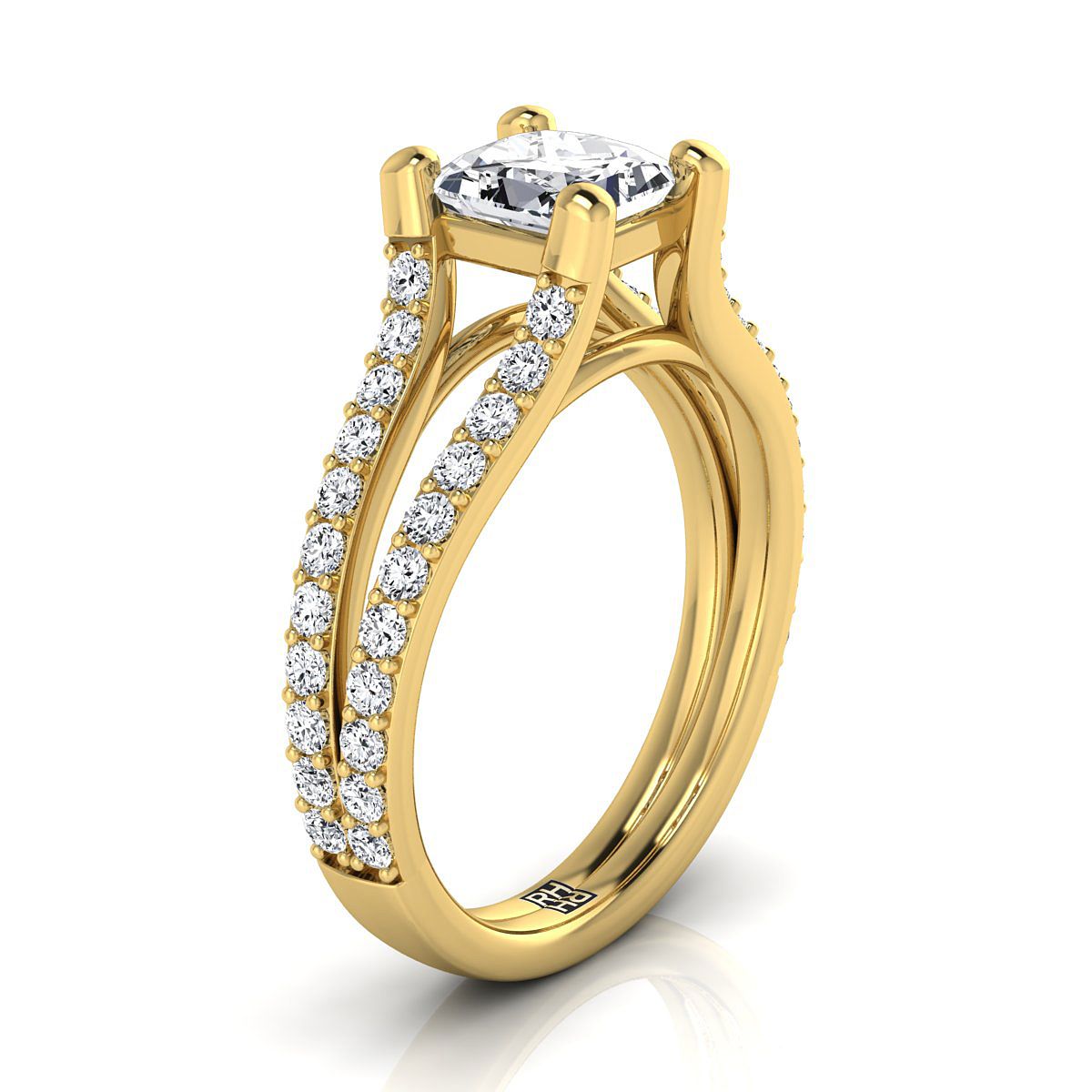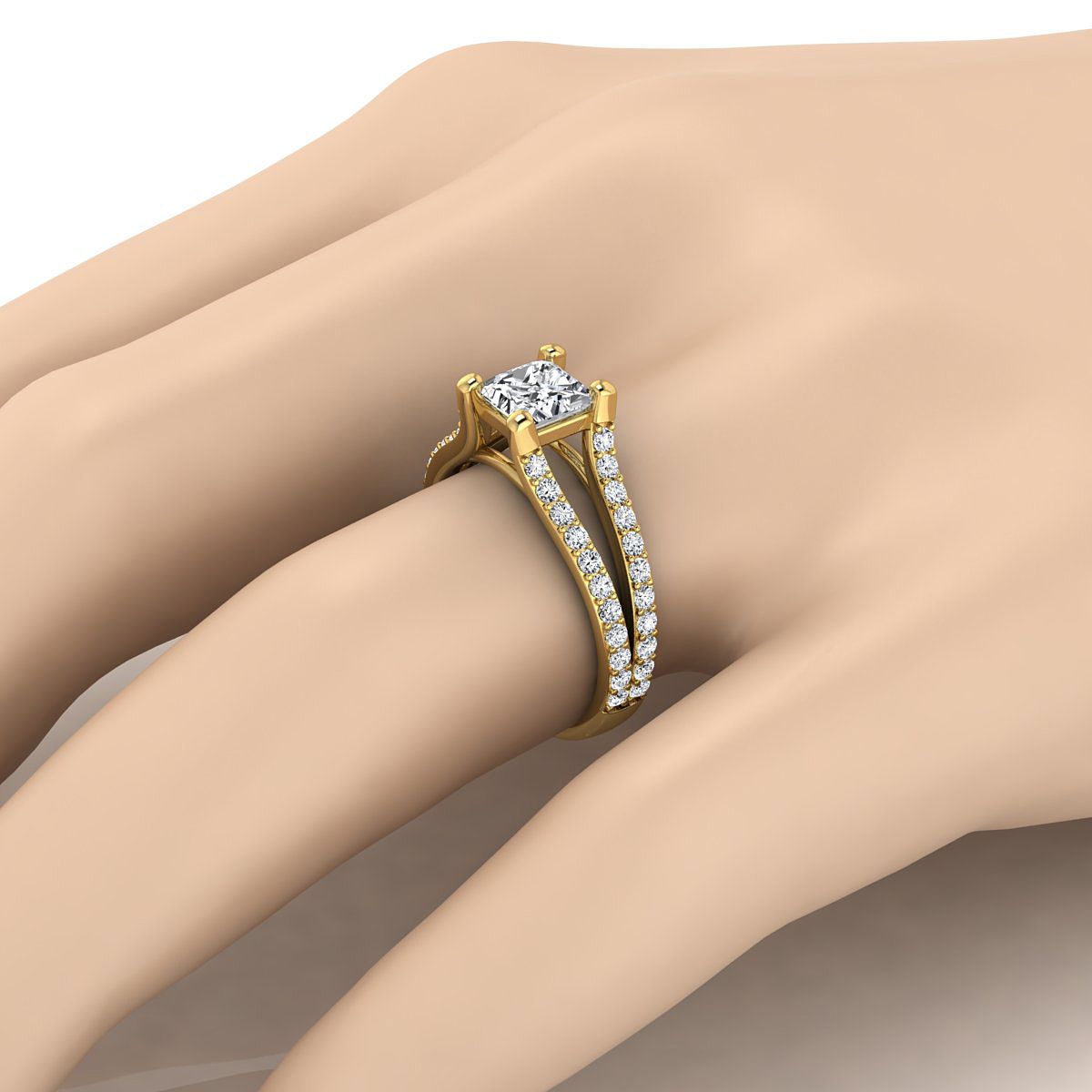 คลาสสิกและสง่างาม แหวนหมั้นเพชรทรงเจ้าหญิงทองคำเหลือง 18k นี้แสดงให้เห็นถึงเพชรเจียระไนแบบ Brilliant Cut (h-i/vs 0.58ctw) ที่ประดับอย่างสวยงามในแบบ Pave บนแหวนที่แยกเป็นสองขา สร้างประกายระยิบระยับที่งดงามให้ทุกคนได้ชื่นชม