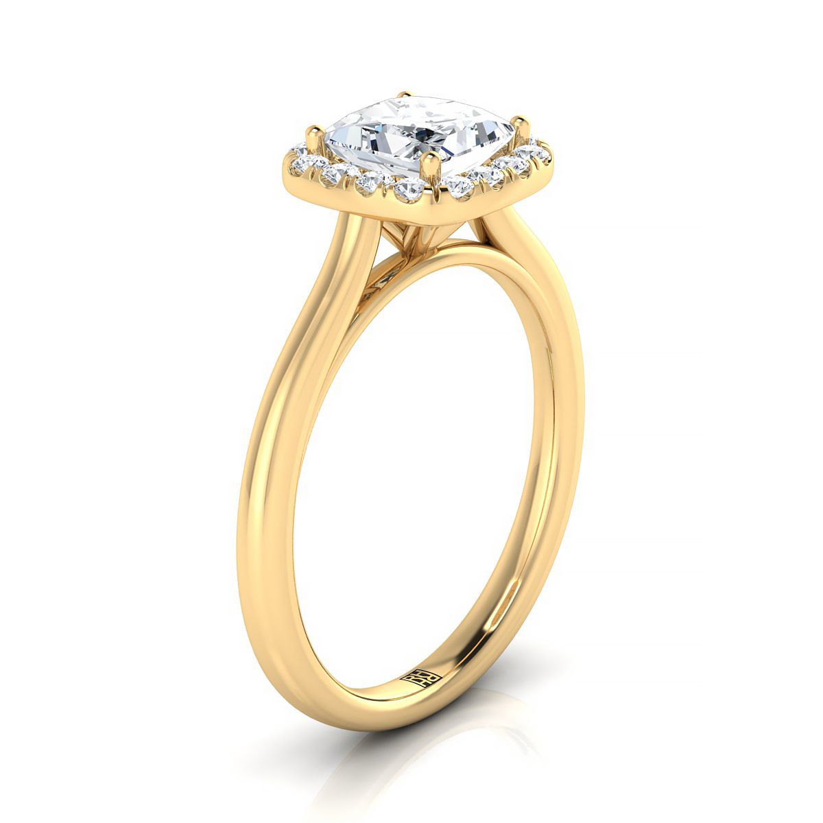 แสดงสไตล์อย่างสง่างาม แหวนหมั้นทรงเจ้าหญิงแบบฮาโลที่มีแถบวงแหวนขัดเงาสูงนี้ โชว์เพชรเจียระไนแบบ Brilliant Cut (h-i/vs 0.20ctw) ที่ประดับอย่างสวยงามในตัวเรือนทองคำ 14k สีเหลืองคลาสสิก