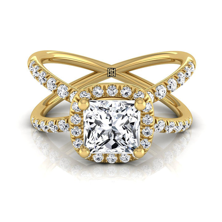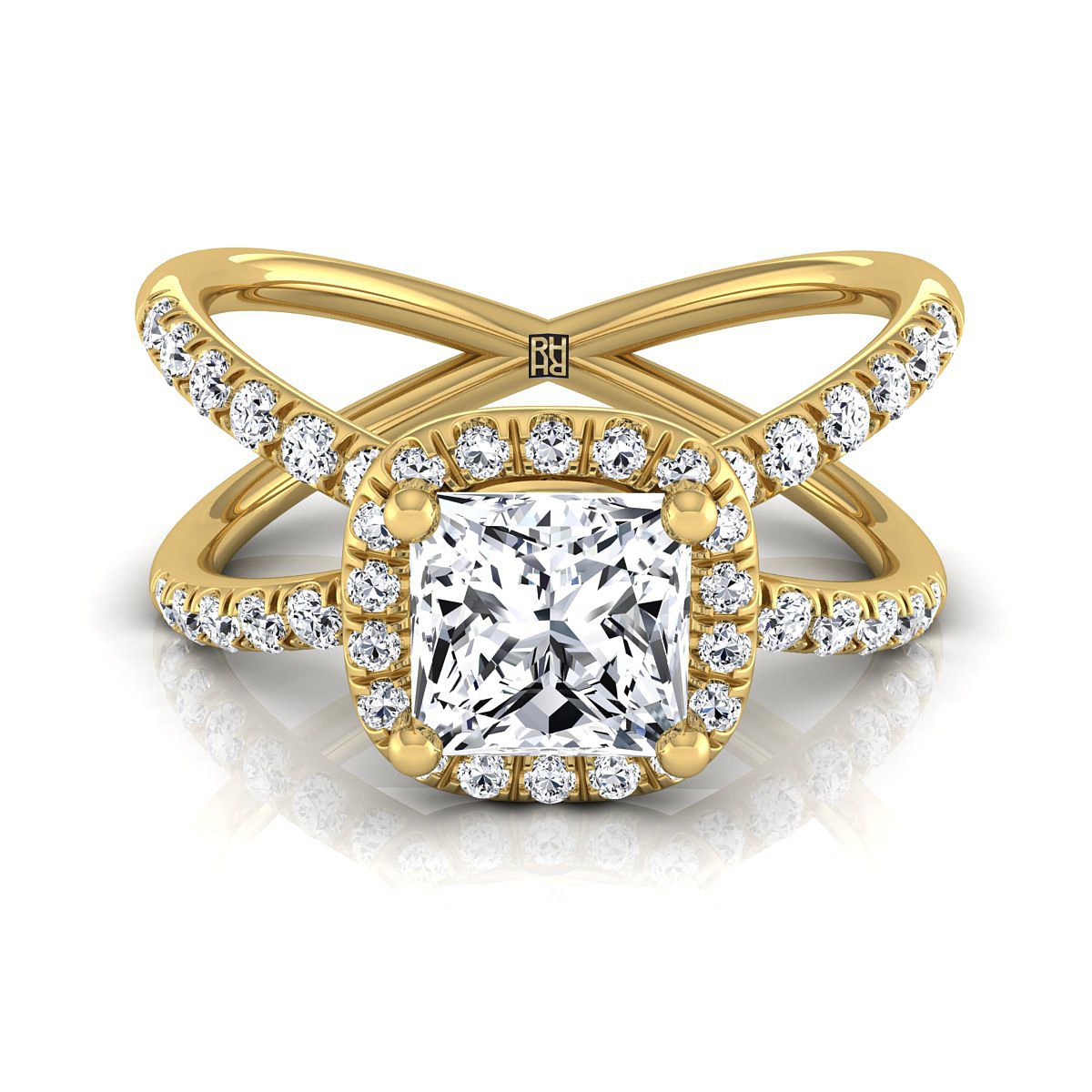 แหวนหมั้นเพชรทรงเจ้าหญิง 18K ทองเหลืองไขว้เปิดฝรั่งเศสประดับเพชรปาเว่ - 1/2ctw