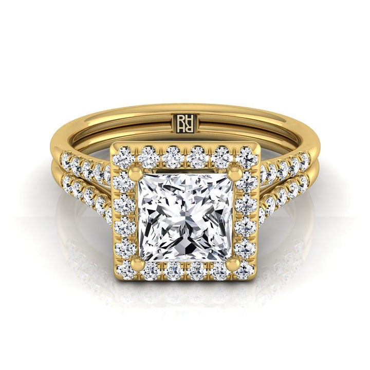 แหวนหมั้นทองคำเหลือง 14K แบบเจ้าหญิง ตัดแบบฝรั่งเศส ประดับเพชรแบบพาเว่ แยกชั้นแบบฮาโล - 3/8ctw