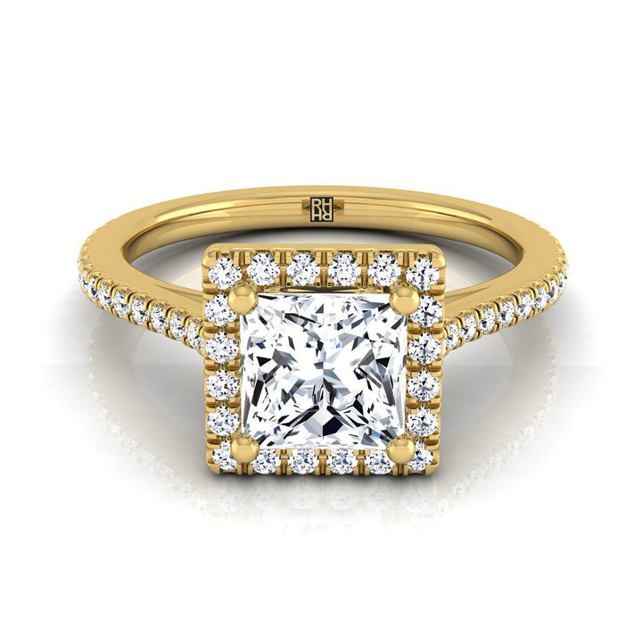 แหวนหมั้นแบบคลาสสิกฝรั่งเศสประดับเพชรทรงเจ้าหญิง 14K ทองคำเหลือง พร้อมฮาโลและเส้นตรง - 1/4ctw