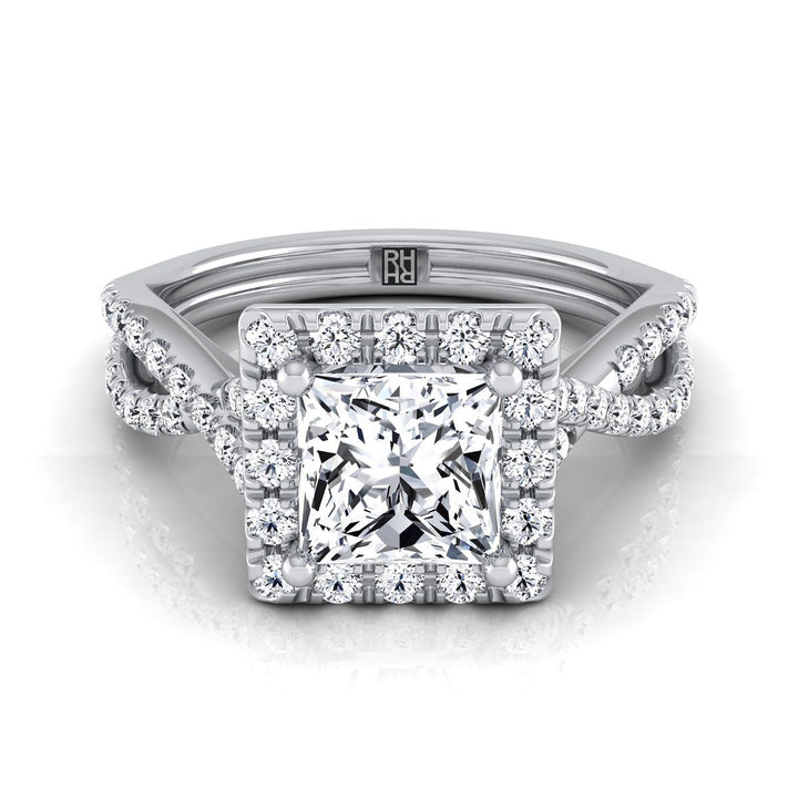 แหวนหมั้นกลางเพชรทรงเจ้าหญิง 14K ทองคำขาว ล้อมด้วยแถบพาเว่แบบบิดและขอบหยัก - 1/2 กะรัตรวม