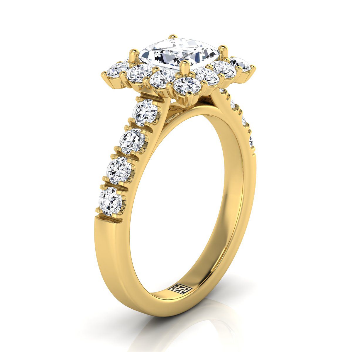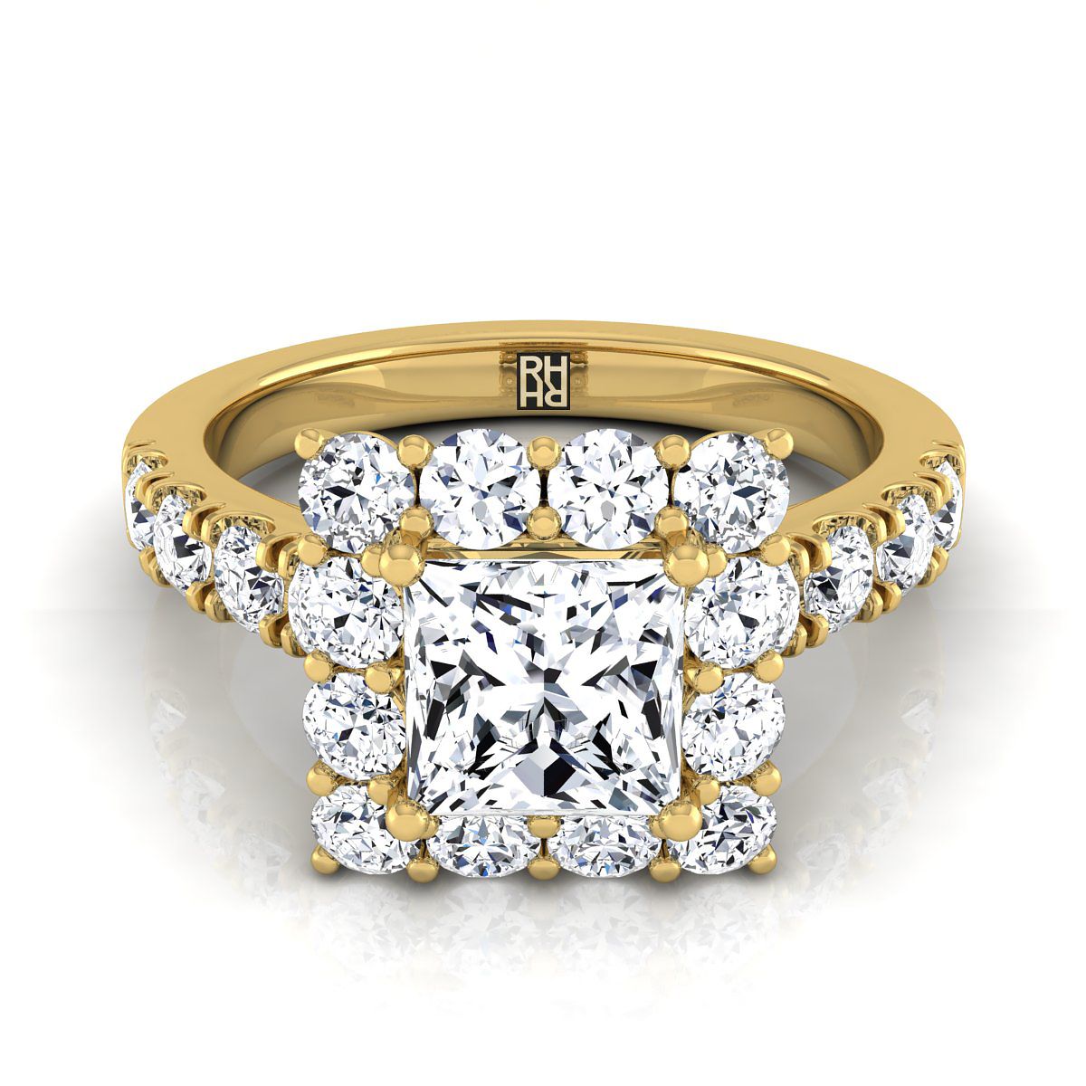 แหวนหมั้นสไตล์หรูหราประดับเพชรทรงเจ้าหญิง 18K ทองคำเหลือง ฝรั่งเศสแบบปาเว่ ฮาโล -1-1/10ctw