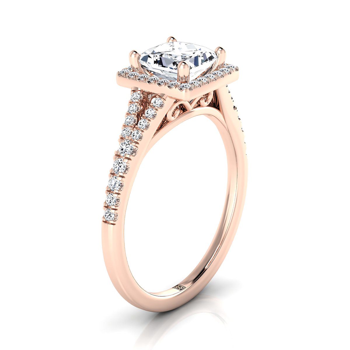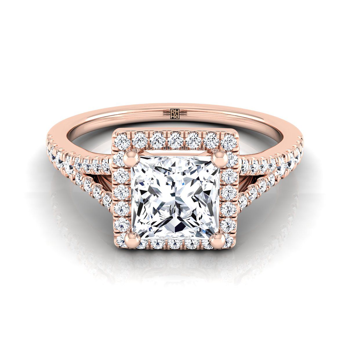 แหวนหมั้นทองคำชมพู 14K แบบเจ้าหญิง ตัดฝรั่งเศส ประดับเพชรแบบพาเว่ แยกชั้นแบบฮาโล - 1/4ctw