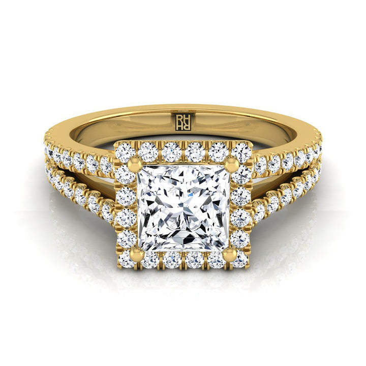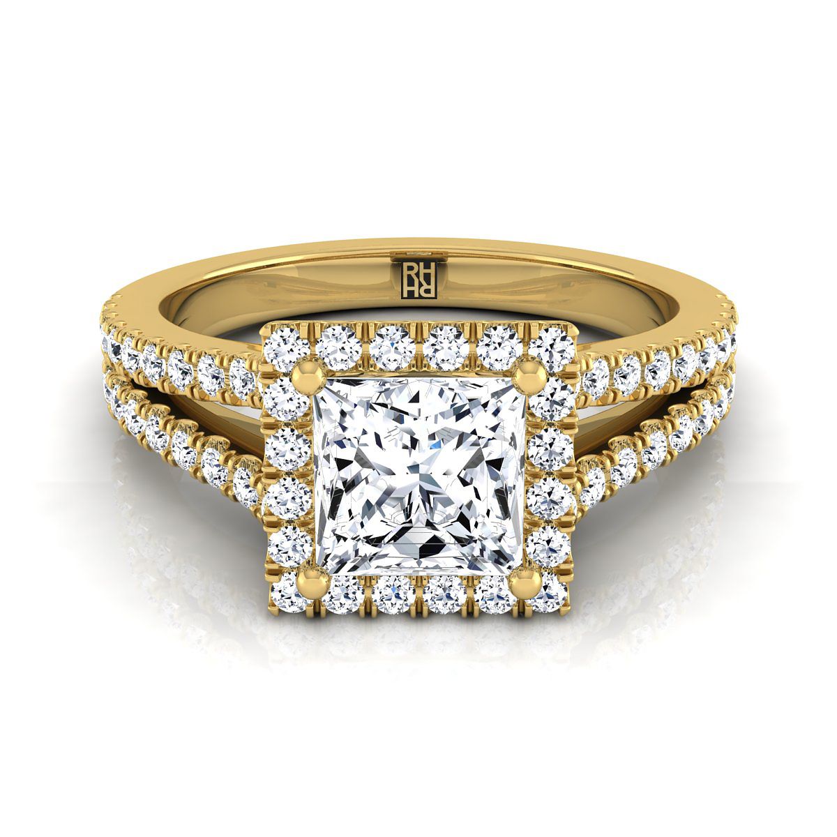 แหวนหมั้นทองคำเหลือง 14K ประดับเพชรทรงเจ้าหญิงแบบฮาโลกลาง พร้อมชิ้นแยกแบบฝรั่งเศสประดับเพชร 3/8 กะรัต