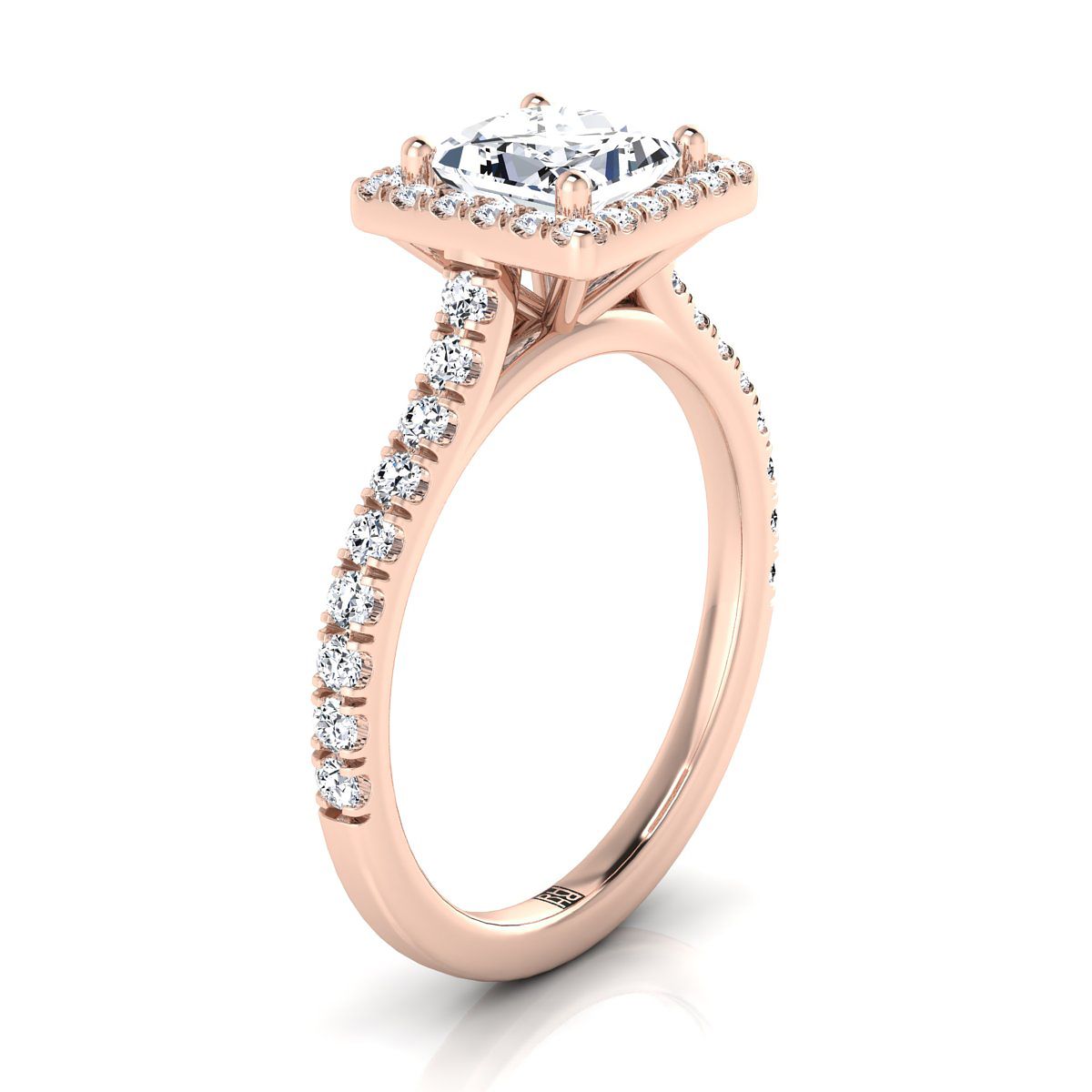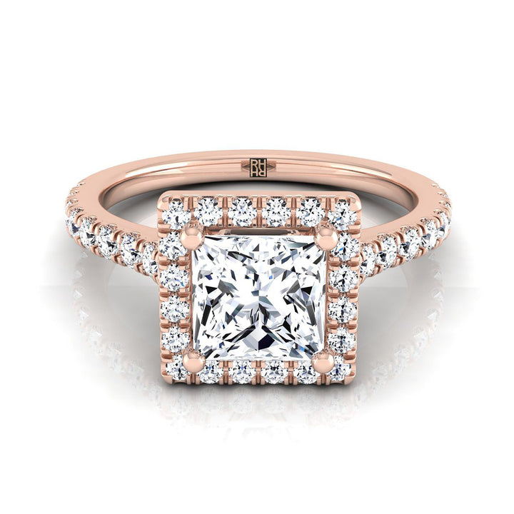 แหวนหมั้นเพชรทรงเจ้าหญิง 14K ทองกุหลาบ ประดับเพชรแบบหนามเตยร่วมและฮาโลแบบฝรั่งเศส - 3/8ctw