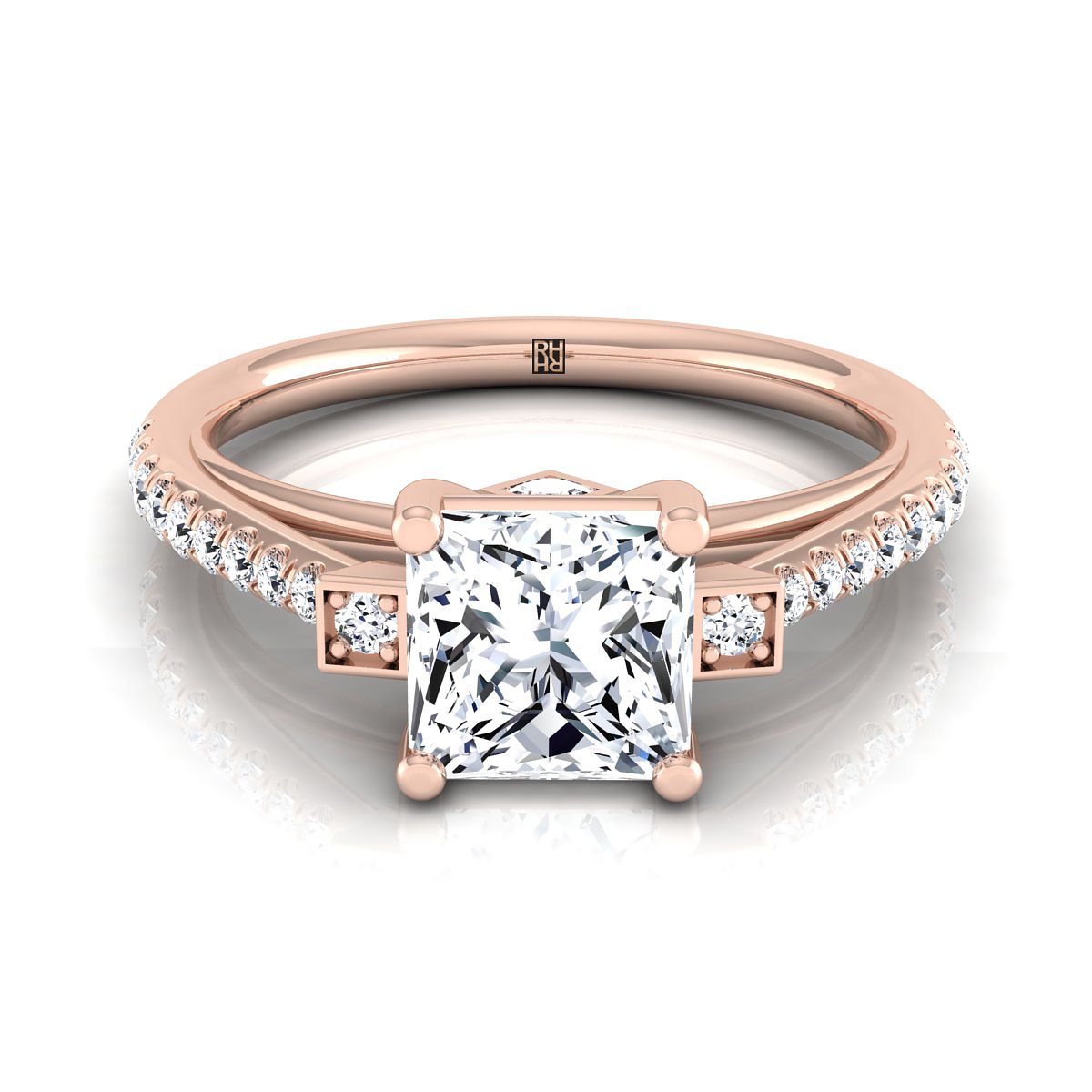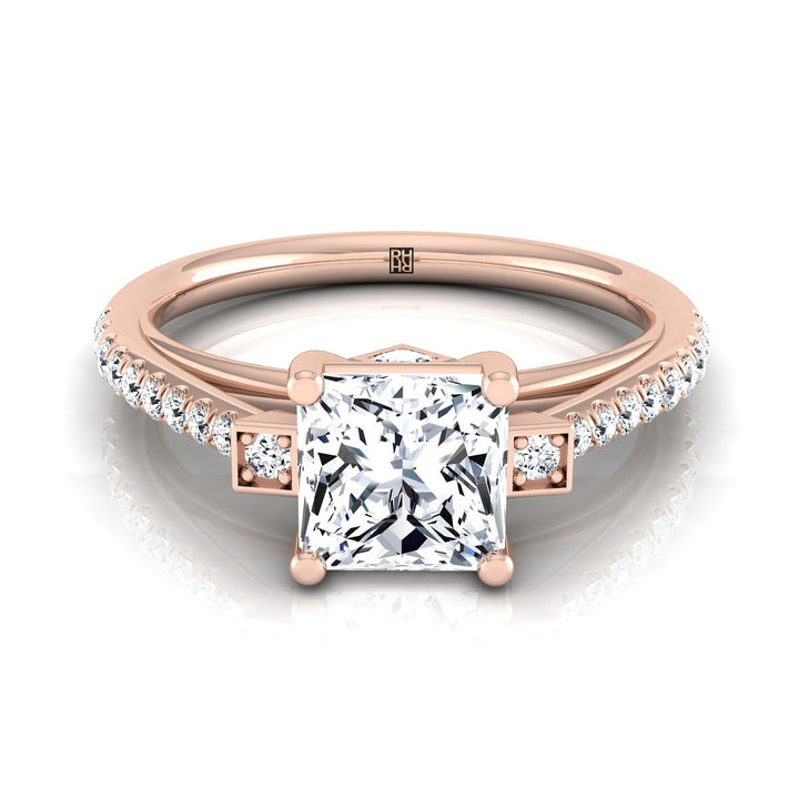 แหวนหมั้นเพชรสามก้อนประดับเพชรแบบปาเว่ ตัดทรงเจ้าหญิง ทองกุหลาบ 14K น้ำหนักรวม 1/3 กะรัต