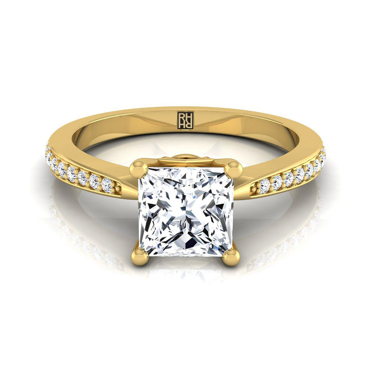 คลาสสิกและสง่างาม, การตั้งแหวนหมั้นเพชรทรงเจ้าหญิงนี้แสดงให้เห็นถึงเพชรเจียระไนแบบ Brilliant Cut (h-i/vs 0.125ctw) ที่ประณีตฝังแบบปาเว่ในทองคำเหลือง 14k