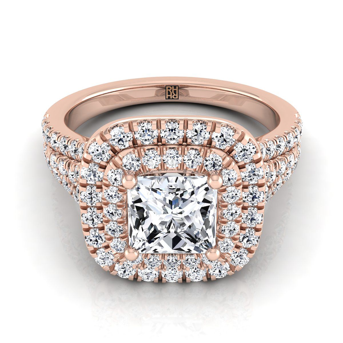 แสดงสไตล์อย่างสง่างาม แหวนหมั้นแบบเจ้าหญิงคัทฮาโลพาเว่ชิ้นนี้นำเสนอเพชรเจียระไนแบบบริลเลียนต์คัท (h-i/vs 0.80ctw) พร้อมกับแถบพาเว่ที่ประณีตติดตั้งในตัวเรือนทองกุหลาบ 14k