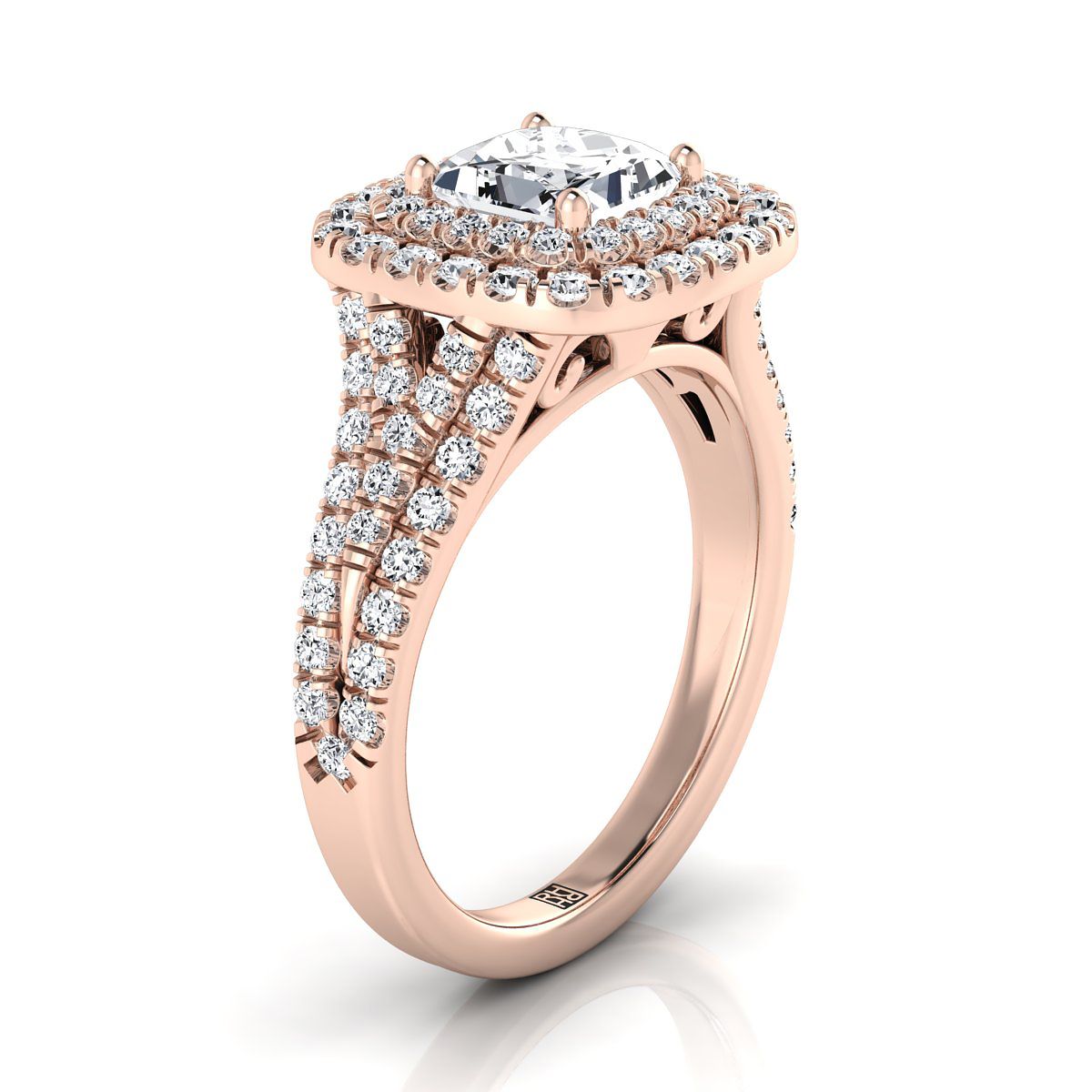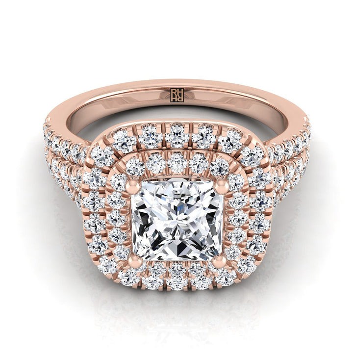 แหวนหมั้นเพชรทรงเจ้าหญิง 14K ทองกุหลาบ ประดับเพชร 4 แถว ตัวเรือนแยกแบบชานเลสคู่และฮาโลคู่ น้ำหนักรวม 7/8 กะรัต