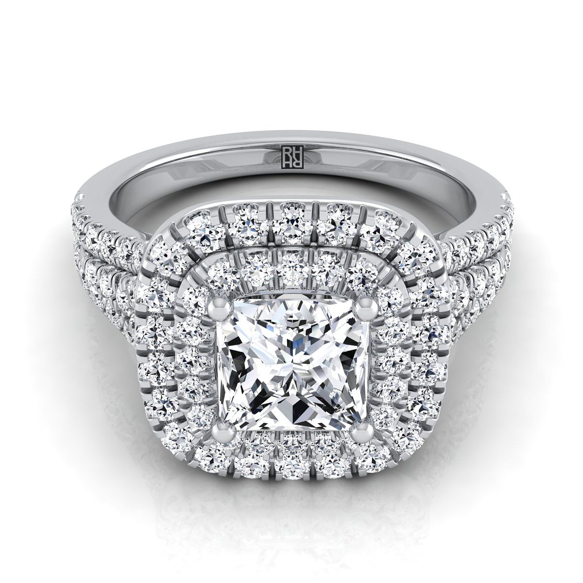 แหวนหมั้นเพชรทรงเจ้าหญิงแพลทินัม แบบสี่แถว แยกชั้น พร้อมเพชรประดับแบบพาเว่และฮาโลคู่ - 7/8ctw