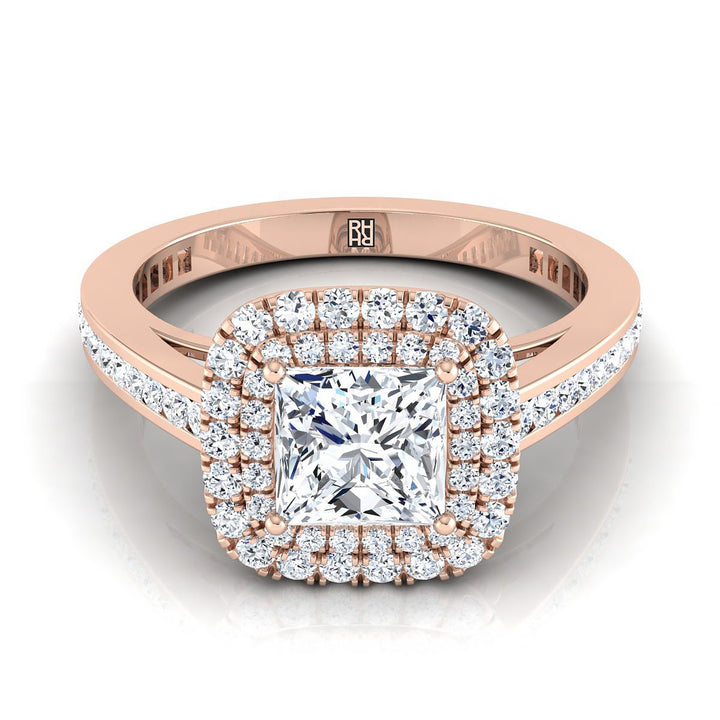 แหวนหมั้นเพชรทรงเจ้าหญิง 14K ทองกุหลาบ พร้อมฮาโลคู่และแชนแนลด้านข้าง - 5/8 กะรัตรวม