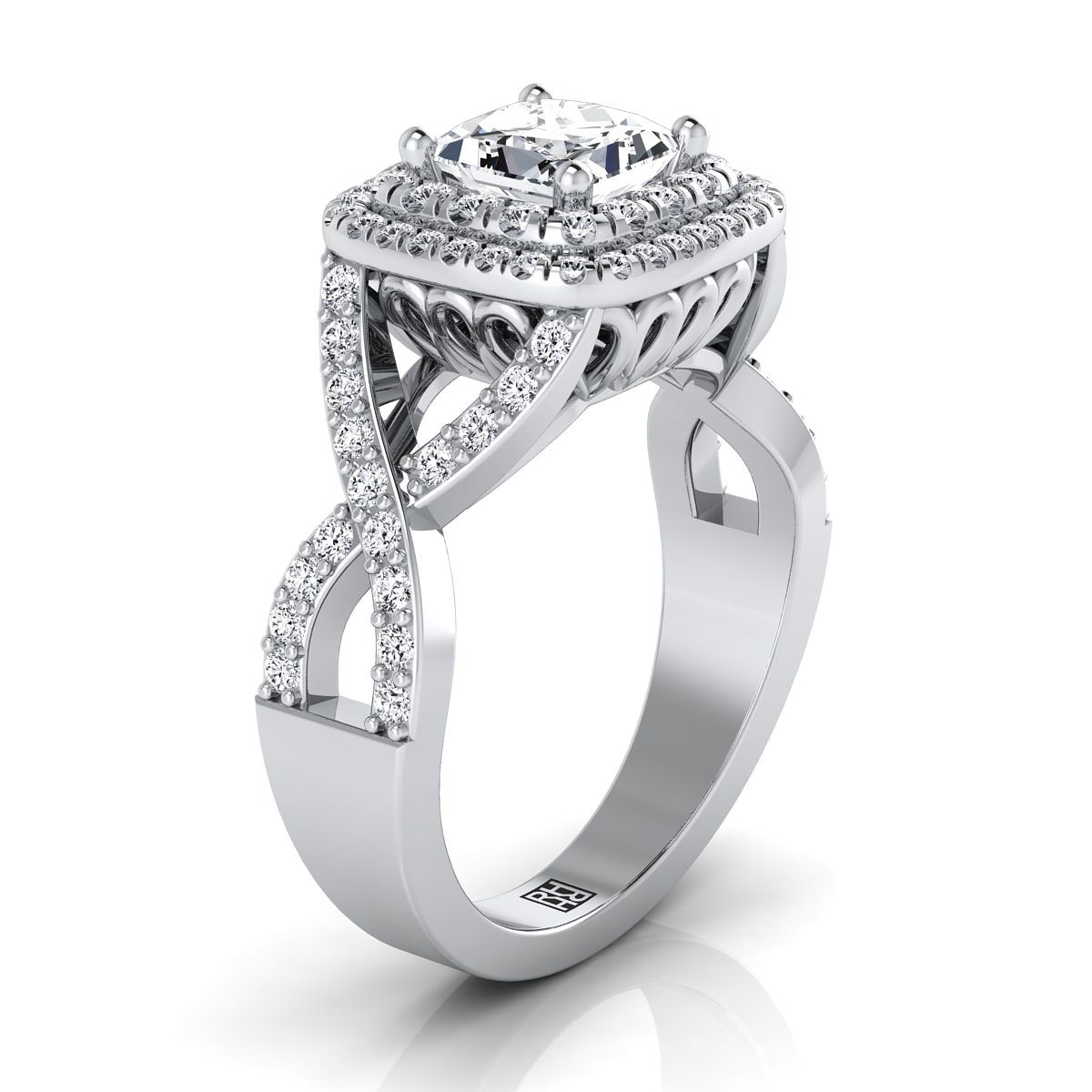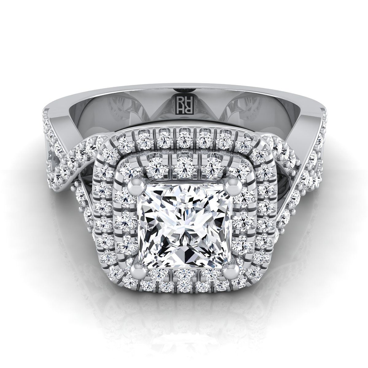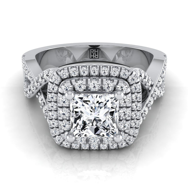 แหวนหมั้นเพชรทรงเจ้าหญิงแบบบิดทองคำขาว 18K ฝรั่งเศสประดับเพชรแบบดับเบิลฮาโล - 1/2ctw
