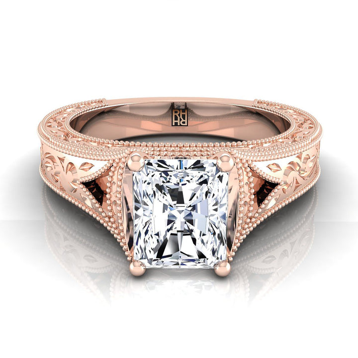 ความสง่างามที่เรียบง่าย แหวนหมั้นเพชรเจียระไนแบบ Radiant นี้ในทองกุหลาบ 14k โชว์การออกแบบสลักที่ได้รับแรงบันดาลใจจากโบราณพร้อมการตกแต่งขอบแบบมิลเกรนคลาสสิก