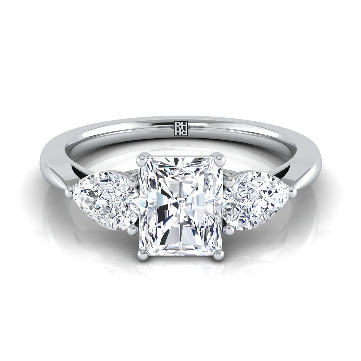 แหวนหมั้นเพชรสามเม็ดรูปทรงลูกแพร์ที่เข้าคู่กันอย่างสมบูรณ์แบบ ตรงกลางเป็นเพชรเจียระไนแบบ Radiant ติดตั้งบนทองคำขาว 18K - 7/8 กะรัตรวม
