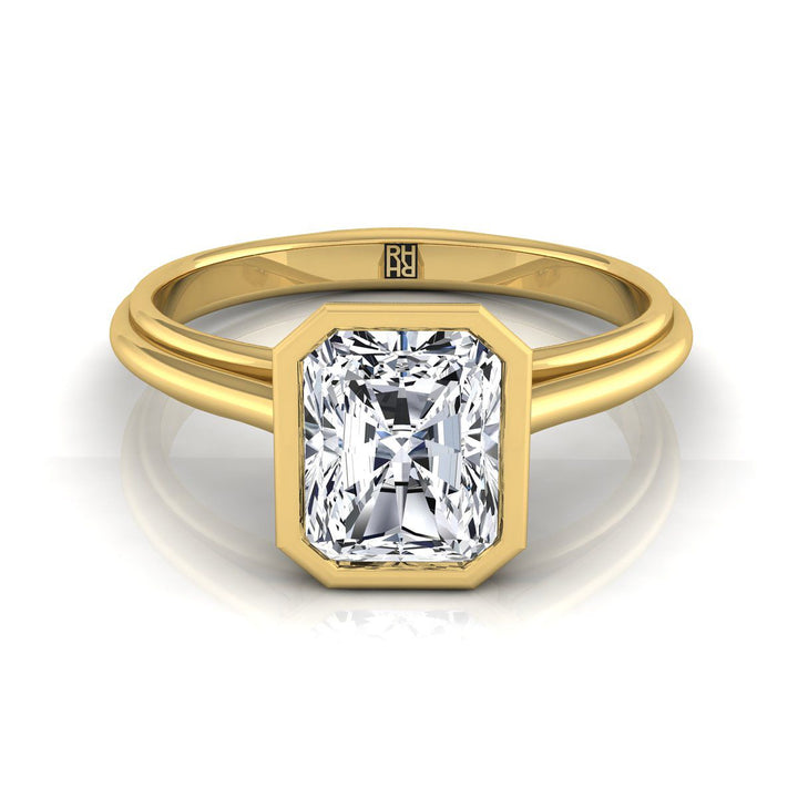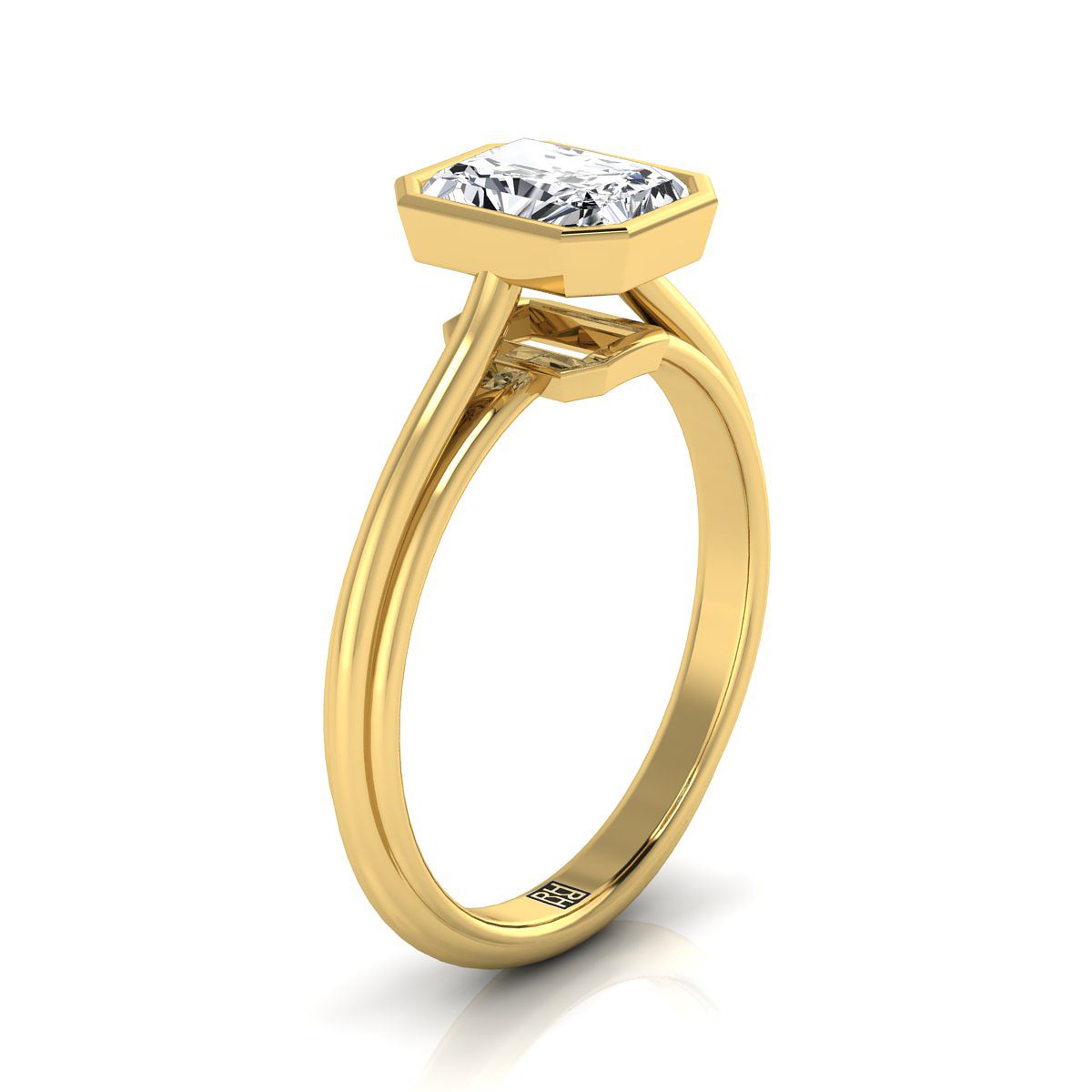 ความสง่างามที่เรียบง่าย, แหวนหมั้นเพชรเจียระไนแบบ Radiant นี้แสดงให้เห็นเพชรโซลิแทร์ที่ตั้งด้วยขอบในตัวเรือนทองคำเหลือง 14 กะรัตแบบคลาสสิก.