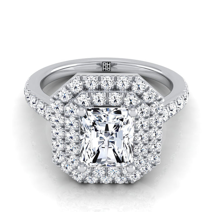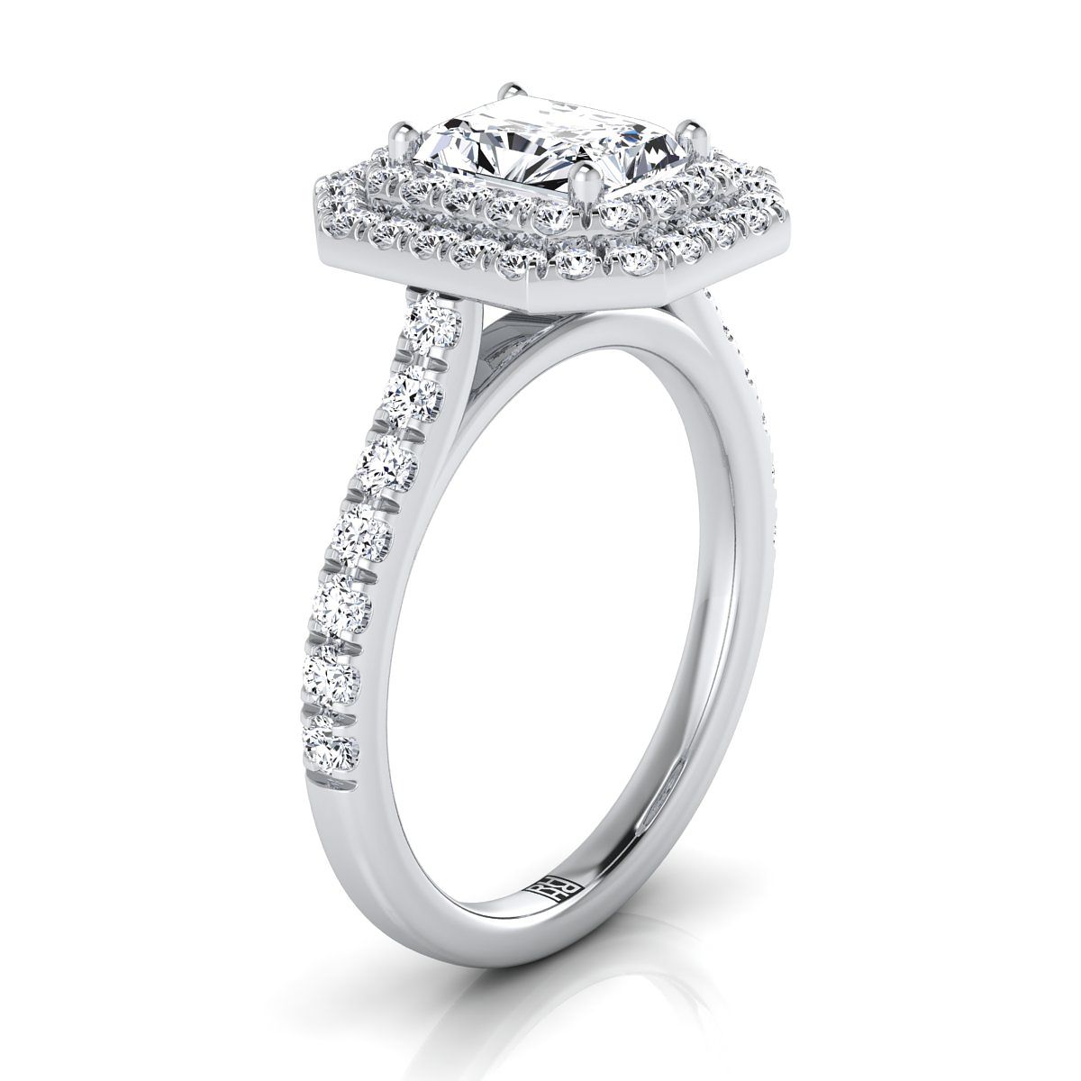 แหวนหมั้นเพชร 14K ทองคำขาว ตัดแบบ Radiant ตรงกลาง พร้อมฮาโลคู่แบบปาเว่และเพชรเส้นตรง - 7/8ctw