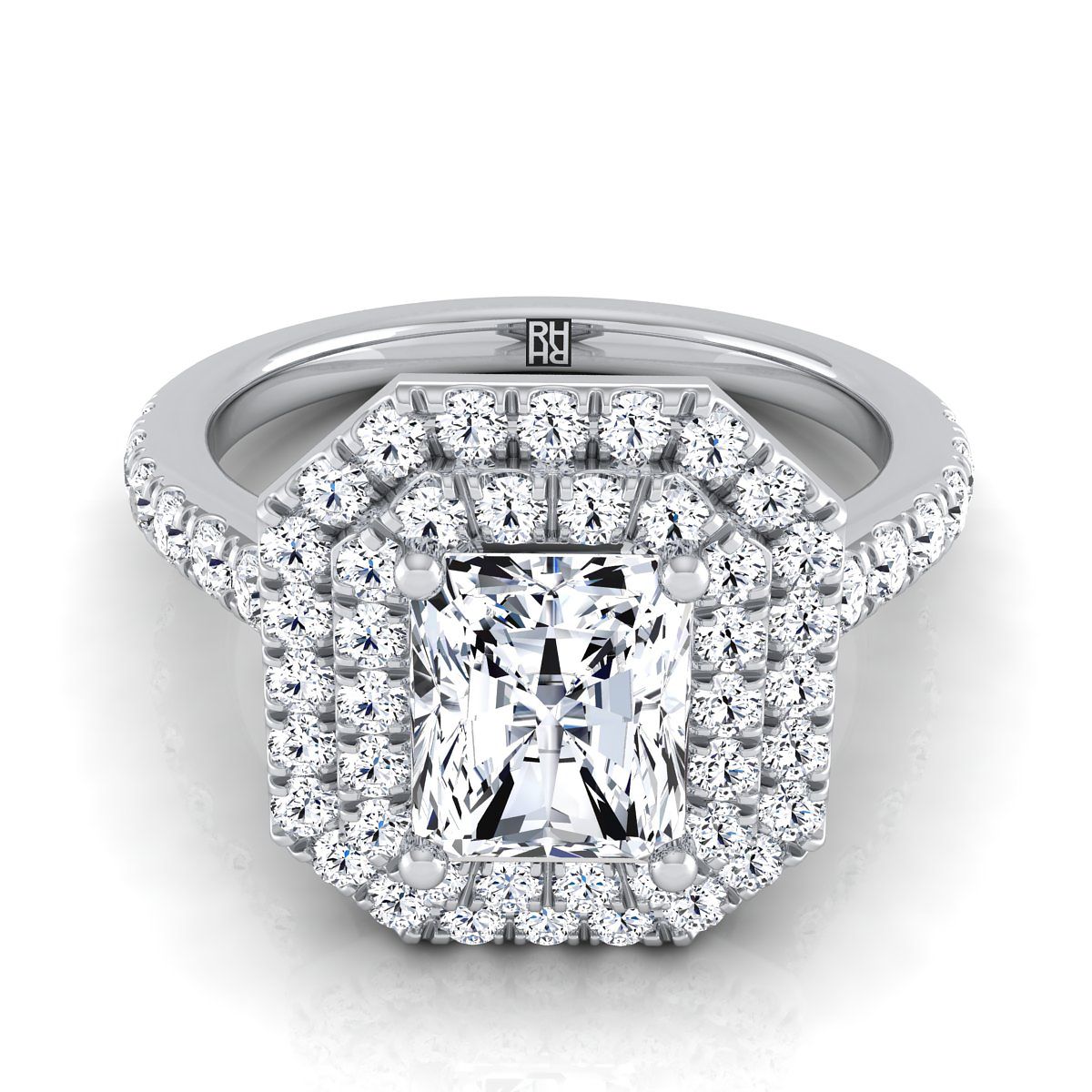 แหวนหมั้นเพชรแพลทินัมแบบเรเดียนต์คัทกลาง พร้อมฮาโลคู่แบบปาเว่และเพชรเส้นตรง - 7/8 กะรัตรวม