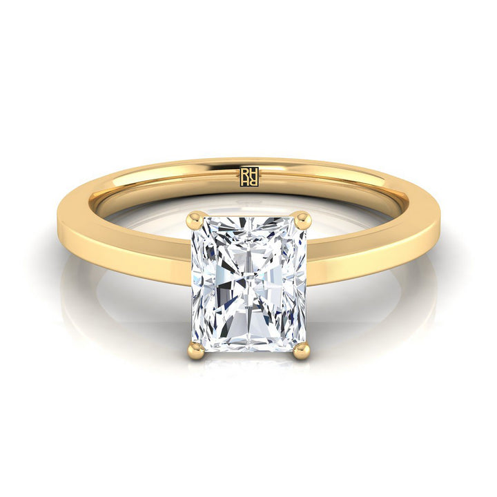 แหวนหมั้นเพชรเม็ดเดี่ยวเจียระไนแบบเรเดียนที่แสดงถึงสไตล์สมัยใหม่นี้ โชว์ขอบเอียงและแหวนวงที่สวมใส่สบายในทองคำ 14 กะรัตสีเหลือง