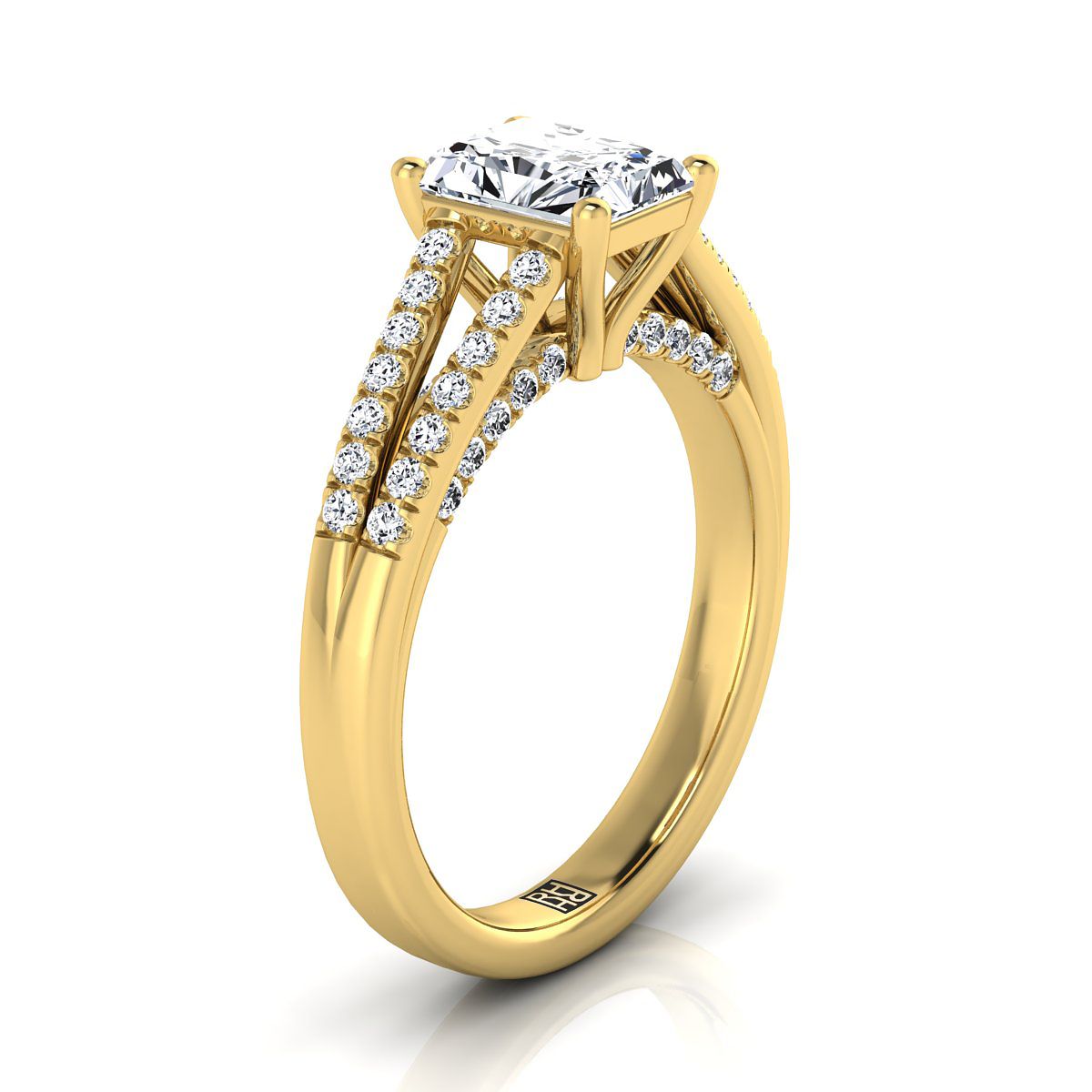 แหวนหมั้นทองคำเหลือง 14K ประดับเพชรกลางทรงเรเดียนต์ ตัดแยกช้างฝรั่งเศสแบบปาเว่ - 1/3 กะรัตรวม