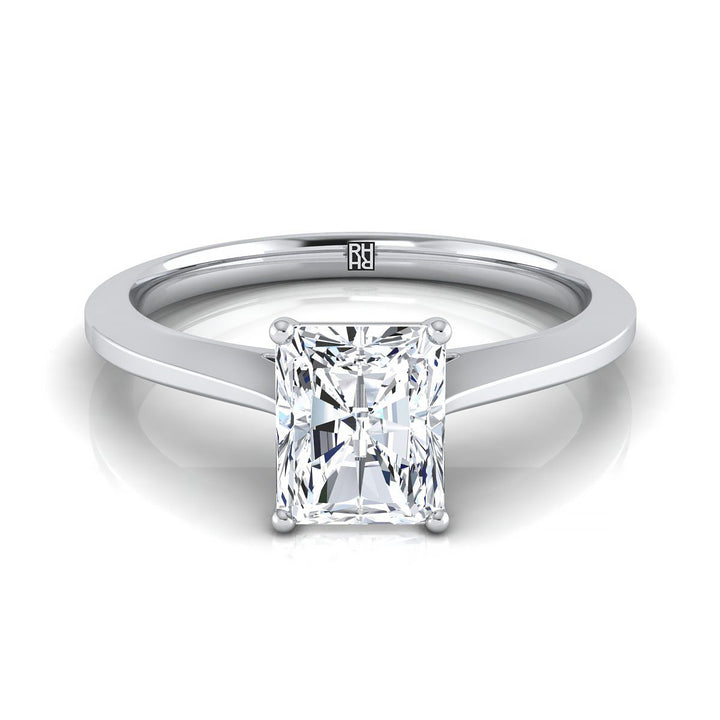 ความสง่างามที่เรียบง่าย แหวนหมั้นเพชรเจียระไนแบบ Radiant นี้แสดงให้เห็นถึงก้านแหวนแบบเฉียงที่มีความหนาเรียงลำดับ พร้อมการตั้งแบบ Cathedral ในทองคำขาว 18 กะรัต