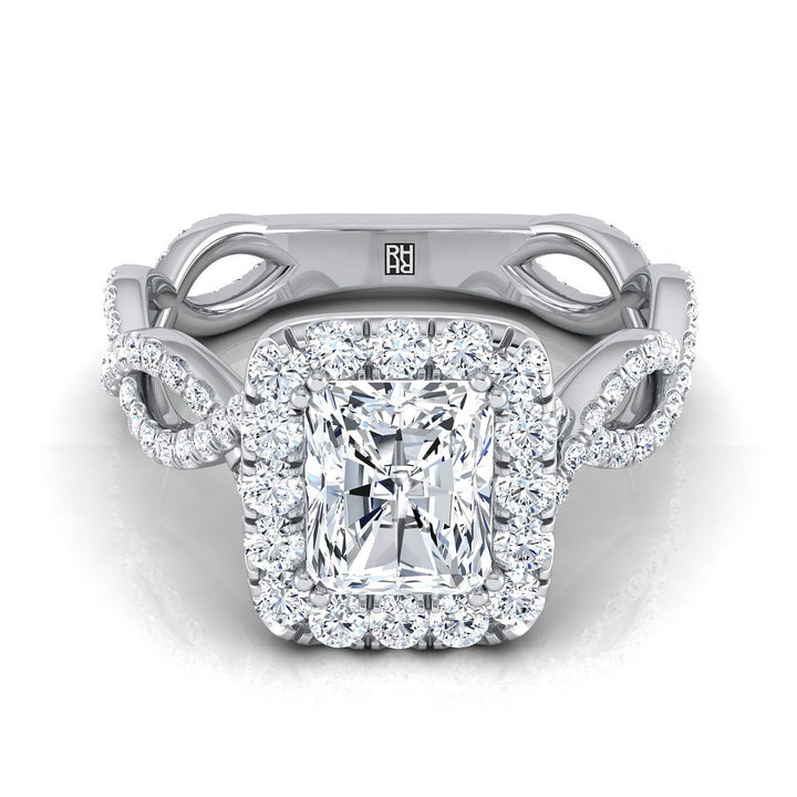 แหวนหมั้นทองคำขาว 18K ประดับเพชรทรงเรเดียนต์ตรงกลาง พร้อมริบบิ้นบิดและฮาโลว์ฝรั่งเศสแบบปาเว่ - 3/4 กะรัตรวม