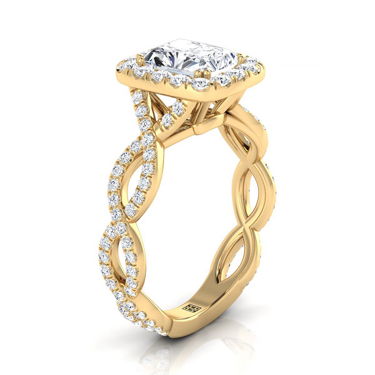 แหวนหมั้นเพชรกลางแบบตัดแรดิแอนท์ทองคำเหลือง 18K ริบบิ้นบิดพร้อมฮาโลฝรั่งเศสแบบปาเว่ - 3/4ctw