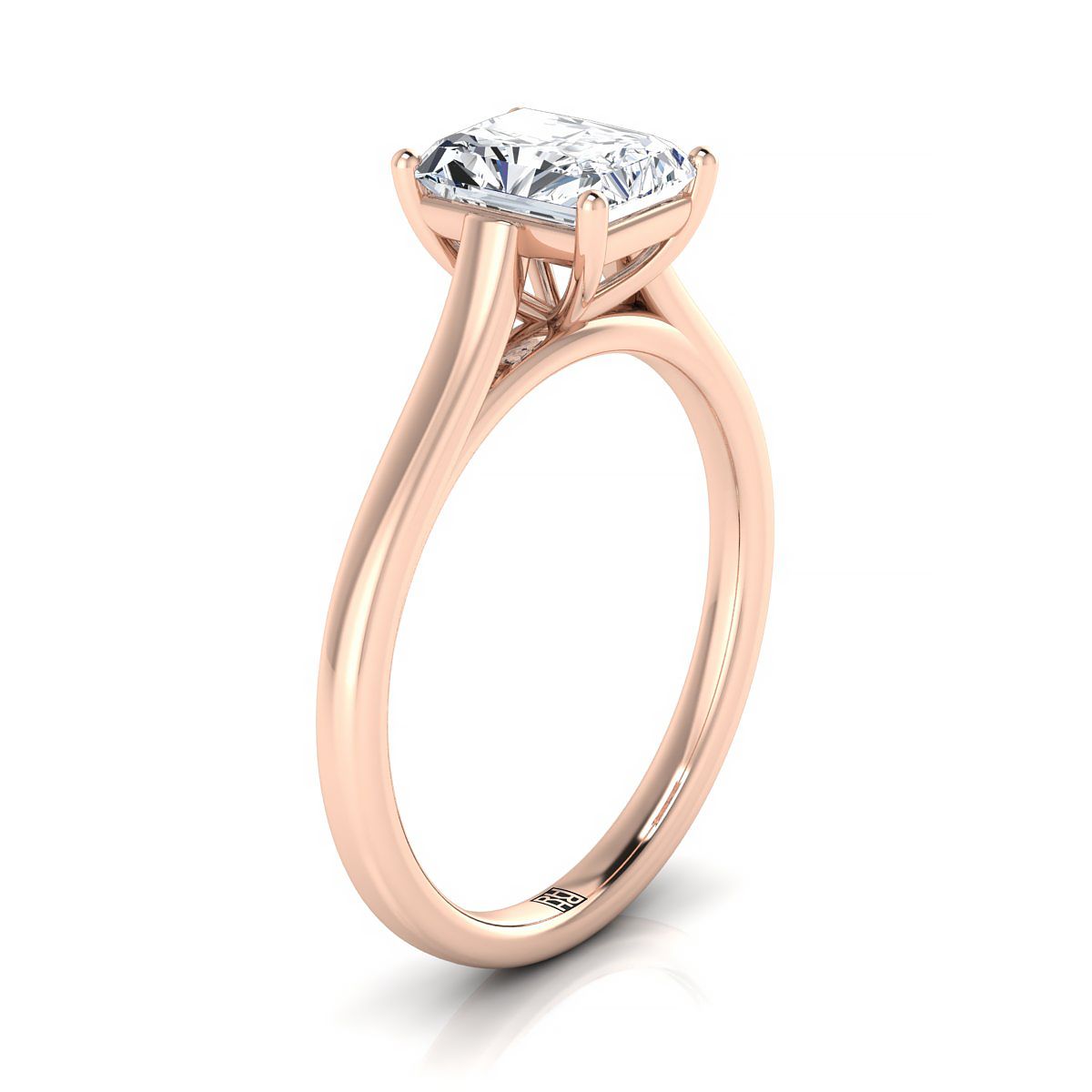 แหวนหมั้นเดี่ยวเจียระไนแบบเรเดียนท์ที่แสดงถึงสไตล์คลาสสิกนี้ มีขอบแหวนแบบสี่เหลี่ยมและการตั้งแบบวิหารในทองกุหลาบ 14 กะรัต