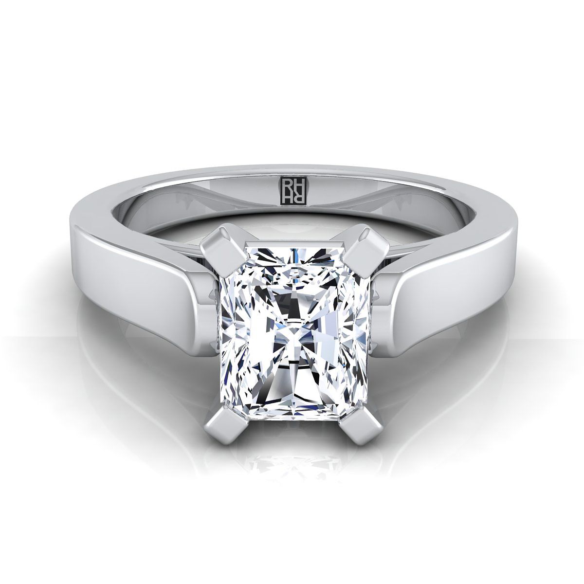 ความสง่างามที่เรียบง่าย แหวนหมั้นเพชรเม็ดเดี่ยวเจียระไนแบบ Radiant นี้มีการตั้งศูนย์แบบ Cathedral พร้อมขอบแบนขัดเงาสูงในทองคำขาว 18 กะรัต
