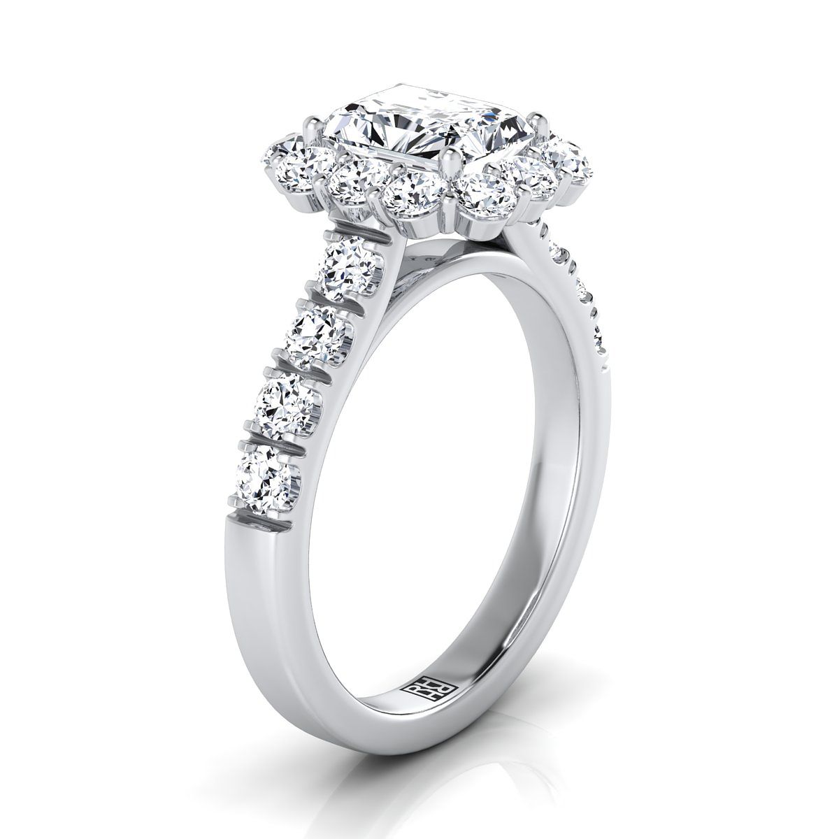 แสดงออกถึงสไตล์ที่สง่างาม แหวนหมั้นเรเดียนท์ฮาโลว์แบบปาเว่ชิ้นนี้นำเสนอเพชรเจียระไนแบบบริลเลียนท์คัต (h-i/vs 1.10ctw) ที่ประดับอย่างสวยงามในตัวเรือนทองคำขาว 18 กะรัตแบบคลาสสิก