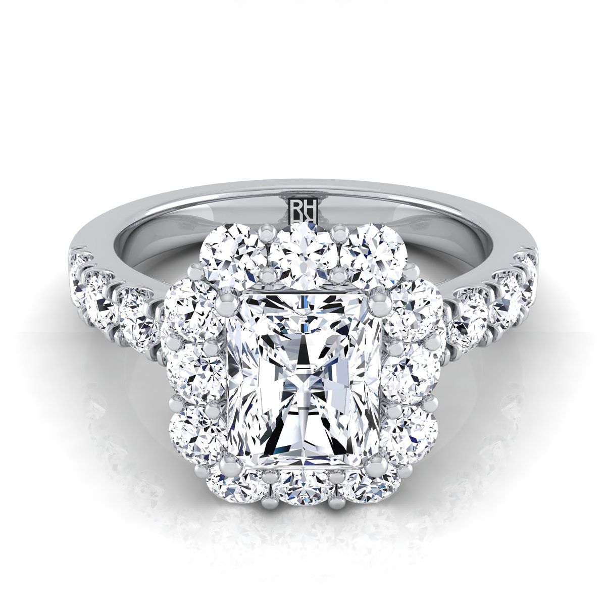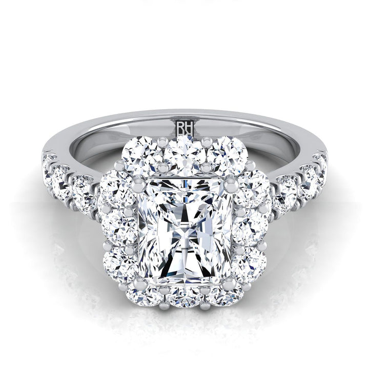 แสดงสไตล์อย่างสง่างาม แหวนหมั้นเรเดียนท์ฮาโลว์พาเว่แสดงเพชรเจียระไนแบบบริลเลียนท์คัท (h-i/vs 1.10ctw) ที่ประดับอย่างสวยงามในตัวเรือนแพลตตินัมคลาสสิก