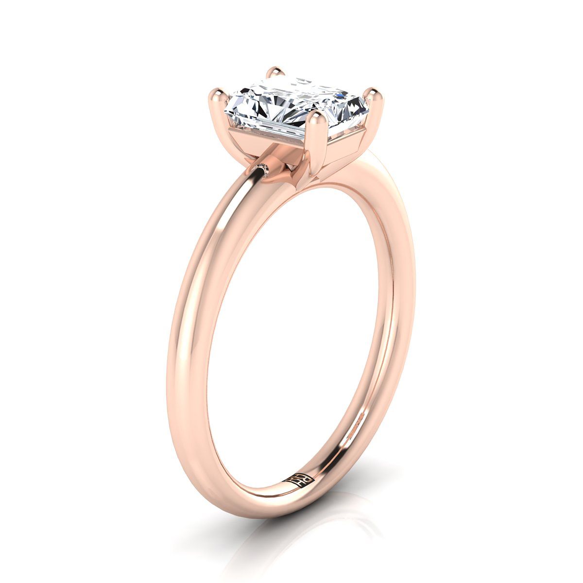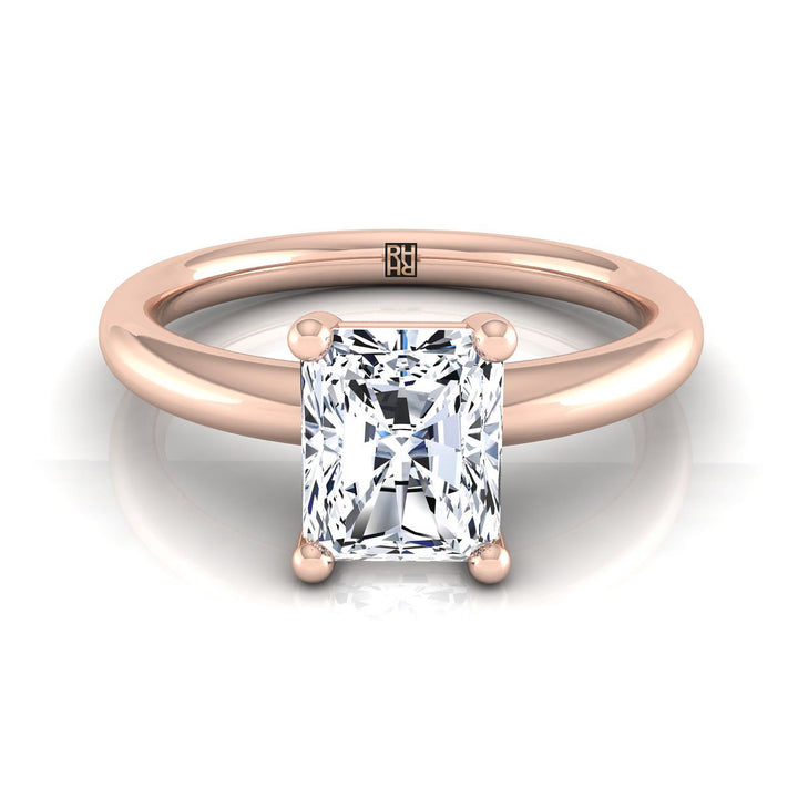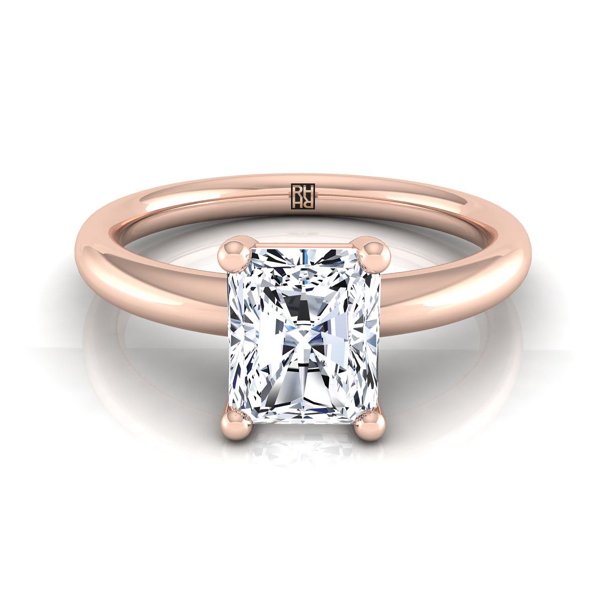 คลาสสิกและสง่างาม แหวนหมั้นเพชรเจียระไนแบบ Radiant Solitaire นี้แสดงให้เห็นการตั้ง 4 กรงพร้อมก้านโค้งมนในทองกุหลาบ 14 กะรัต