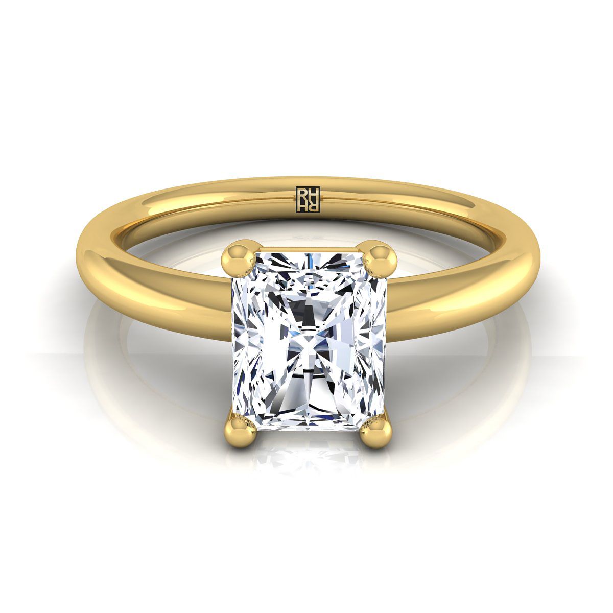 คลาสสิกและสง่างาม แหวนหมั้นเพชรเจียระไนแบบ Radiant Solitaire นี้แสดงให้เห็นการตั้ง 4 กรงพร้อมก้านโค้งมนในทองคำเหลือง 14 กะรัต