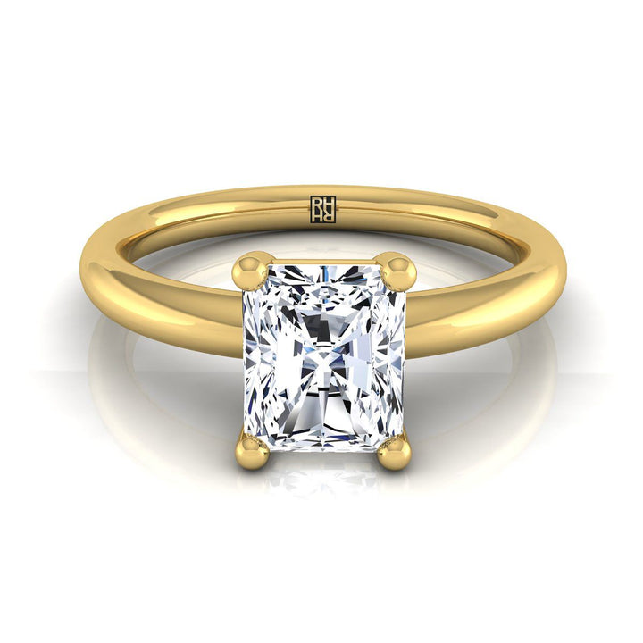 คลาสสิกและสง่างาม แหวนหมั้นเพชรเม็ดเดี่ยวเจียระไนแบบ Radiant นี้แสดงให้เห็นการตั้ง 4 กรงเล็บพร้อมก้านแหวนโค้งมนในทองคำ 18 กะรัตสีเหลือง
