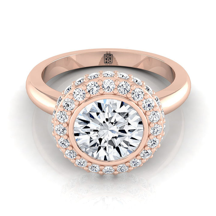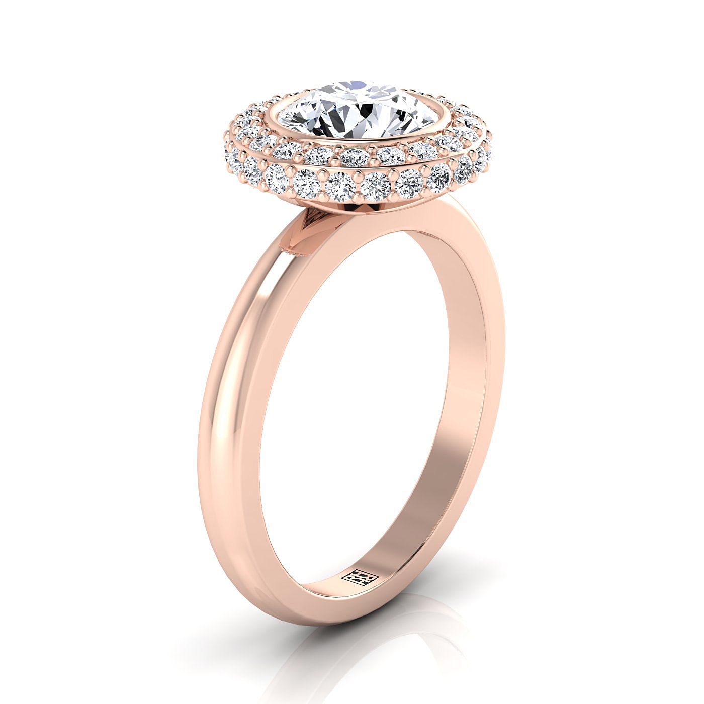 แหวนหมั้นเพชรทรงกลมเจียระไนแบบเบเซิลที่ศูนย์กลางและฮาโลแบบปาเว่ พร้อมแถบแบน ประดับด้วยเพชรเมลีทรงกลมเจียระไน (h-i/vs 0.40ctw) ในตัวเรือนทองกุหลาบ 14 กะรัตคลาสสิก